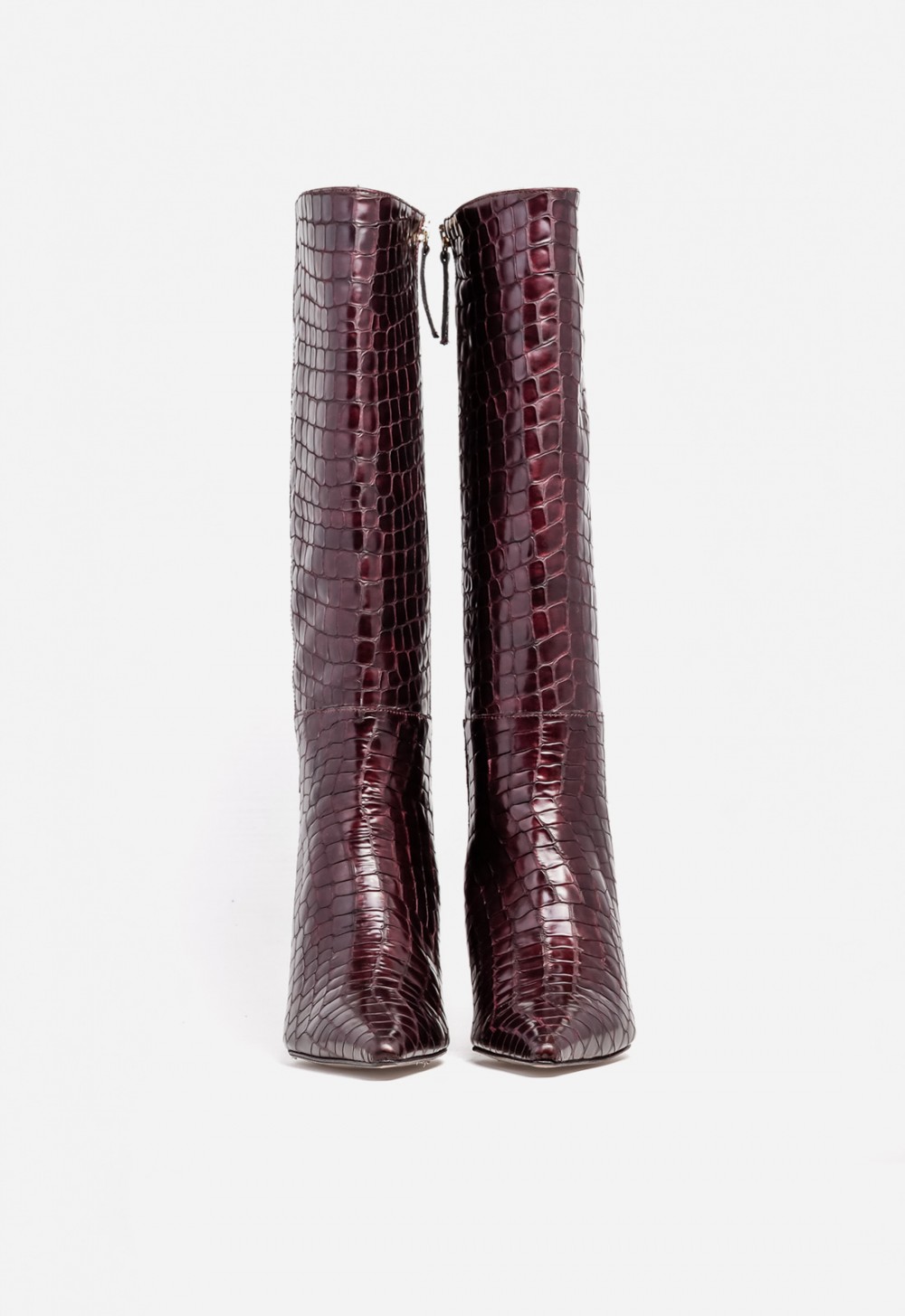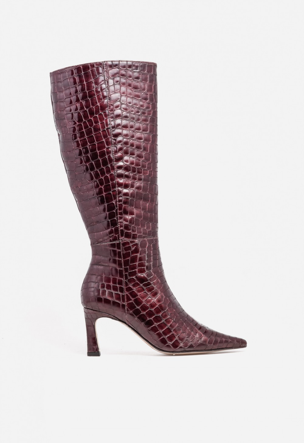 Bota alta de mujer en piel efecto cocodrilo color burdeos, con punta fina y cremallera interior. Diseño español elegante, perfecto para looks sofisticados de Otoño/Invierno.