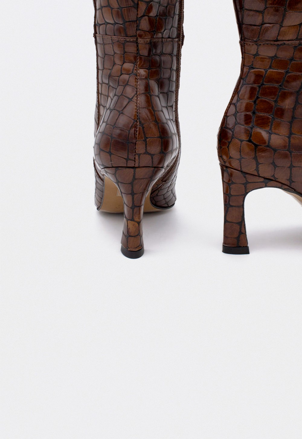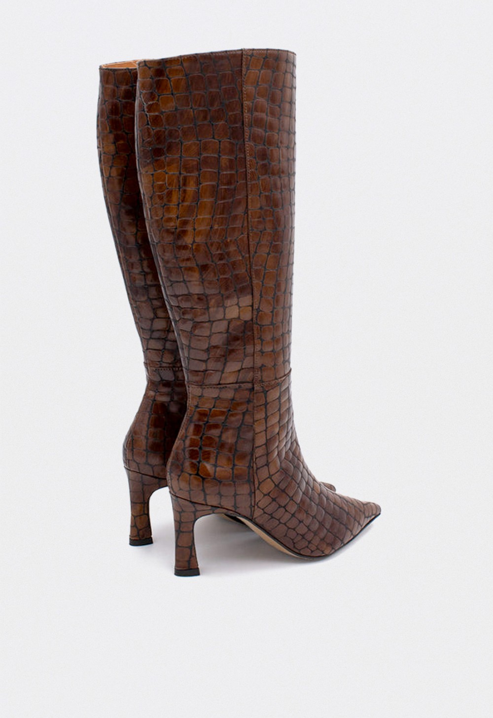 Botas altas Ángel Alarcón Hata en piel efecto cocodrilo color cuero. Punta fina, tacón fino de 6,5 cm y cremallera interna. Estilo elegante y sofisticado, fabricadas en España.