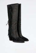 La Bota de Mujer Negra Alma en Pena 0558 es la opción perfecta para quienes buscan un toque de estilo único y elegante. Con una caña ancha adornada con flecos laterales, esta bota tacón de tipo bloque ofrece un diseño atrevido y moderno. La puntera afilada aporta sofisticación, mientras que el tacón de 9,5 cm y la caña de 43 cm te brindan una silueta estilizada y femenina. Sin cierre, esta bota se desliza fácilmente para un look cómodo pero impactante. Ideal para cualquier ocasión en la que desees destacar con elegancia y un toque bohemio.