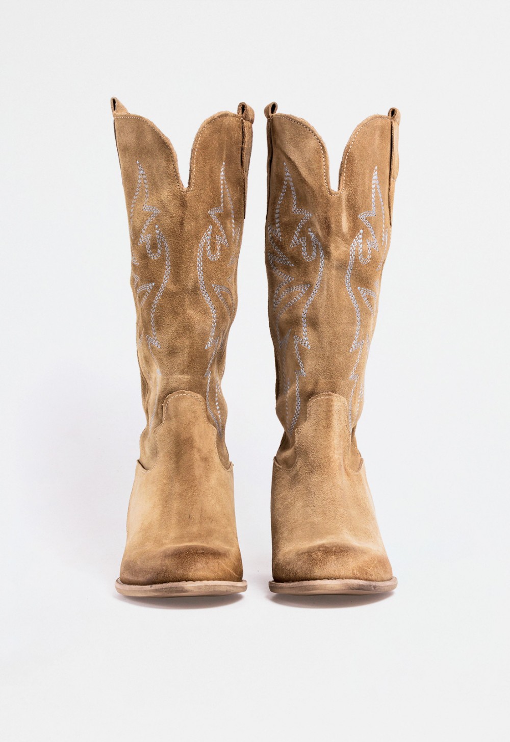Bota estilo cowboy de mujer con bordados decorativos en los laterales y puntera redonda, que suaviza el look sin perder carácter. Ideal para quienes buscan el aire western en una versión más versátil y urbana. Su diseño combina tradición y tendencia, perfecta para acompañar vestidos vaporosos, vaqueros o estilismos más atrevidos.