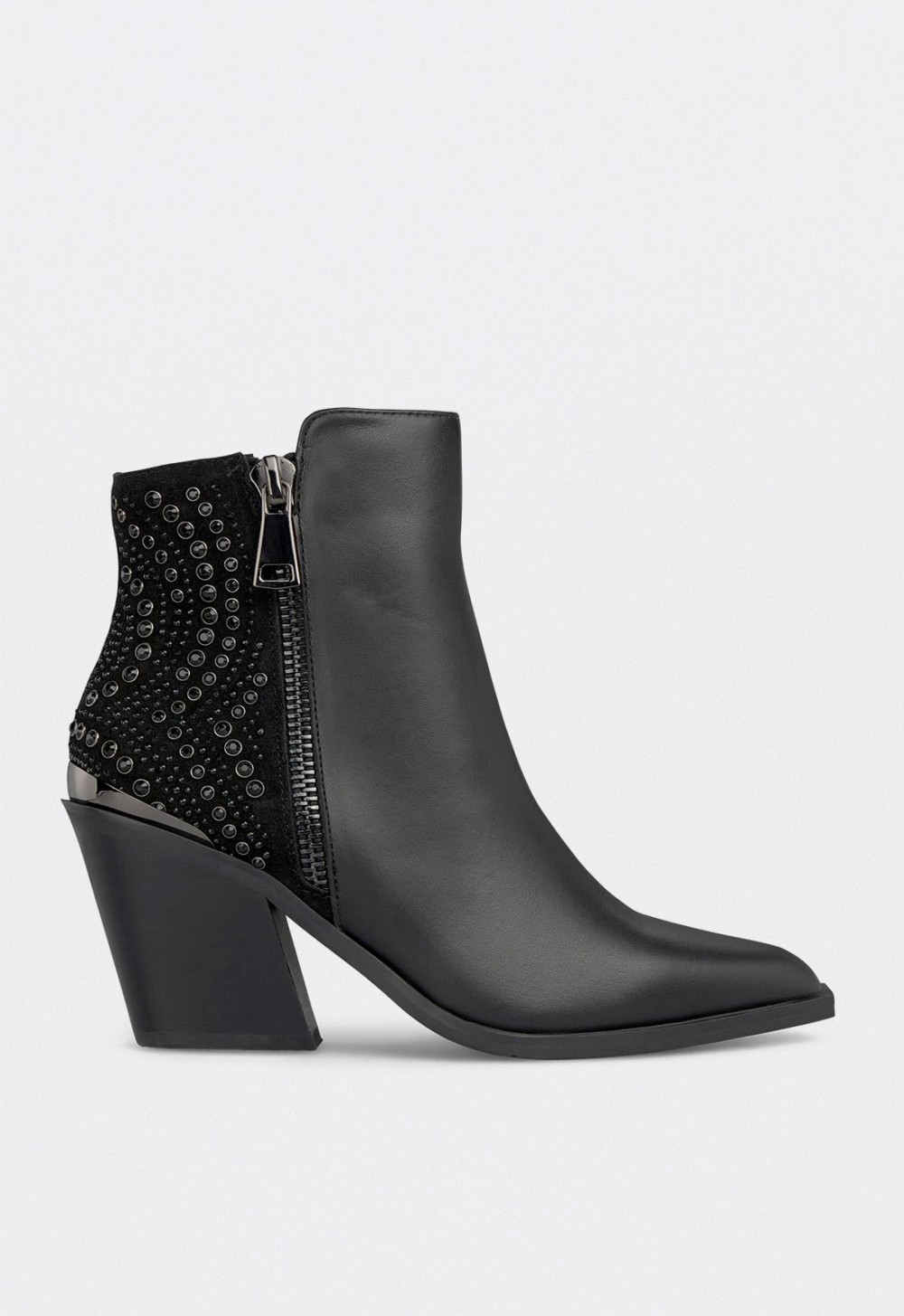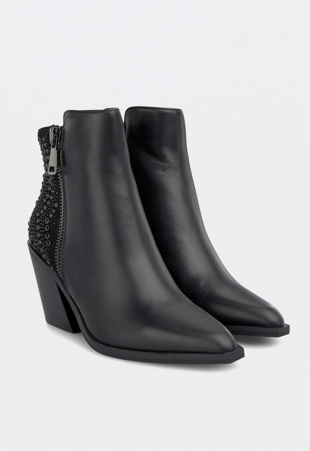Botines de mujer Alma en Pena Napa Black con tacón ancho y detalle joya en el talón