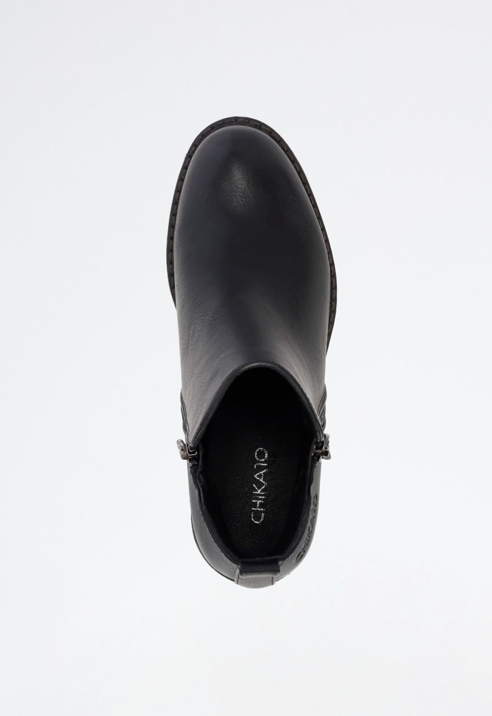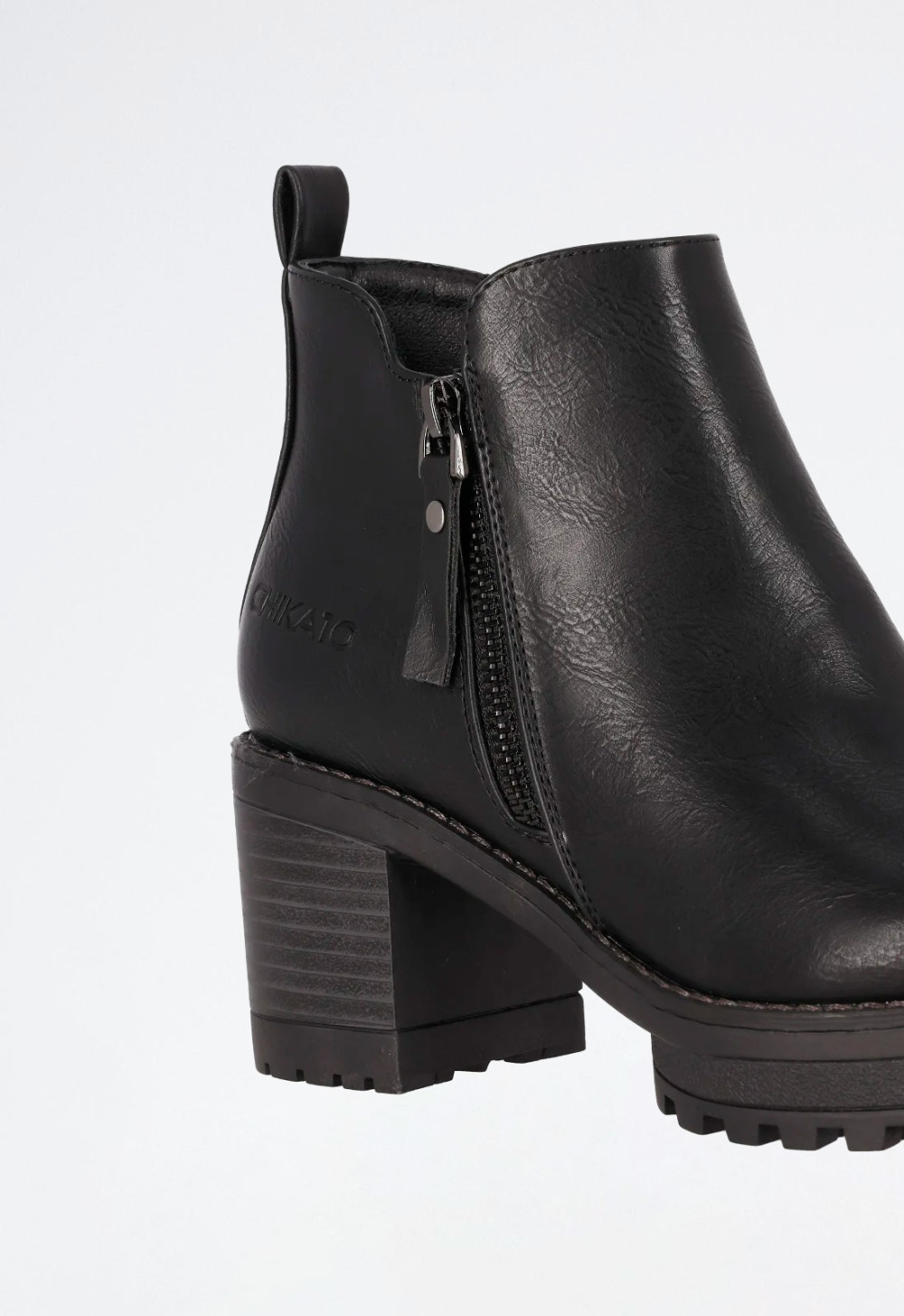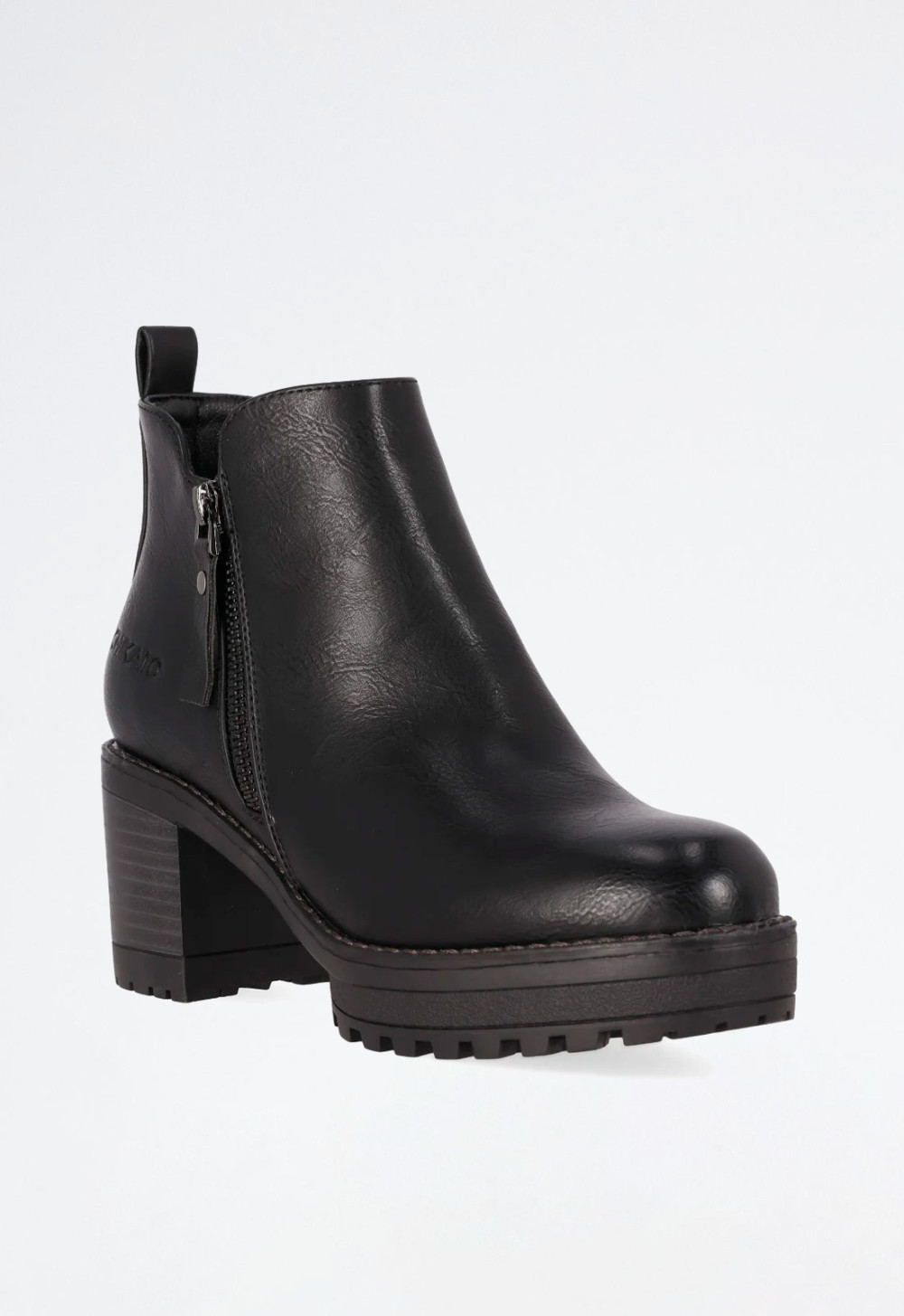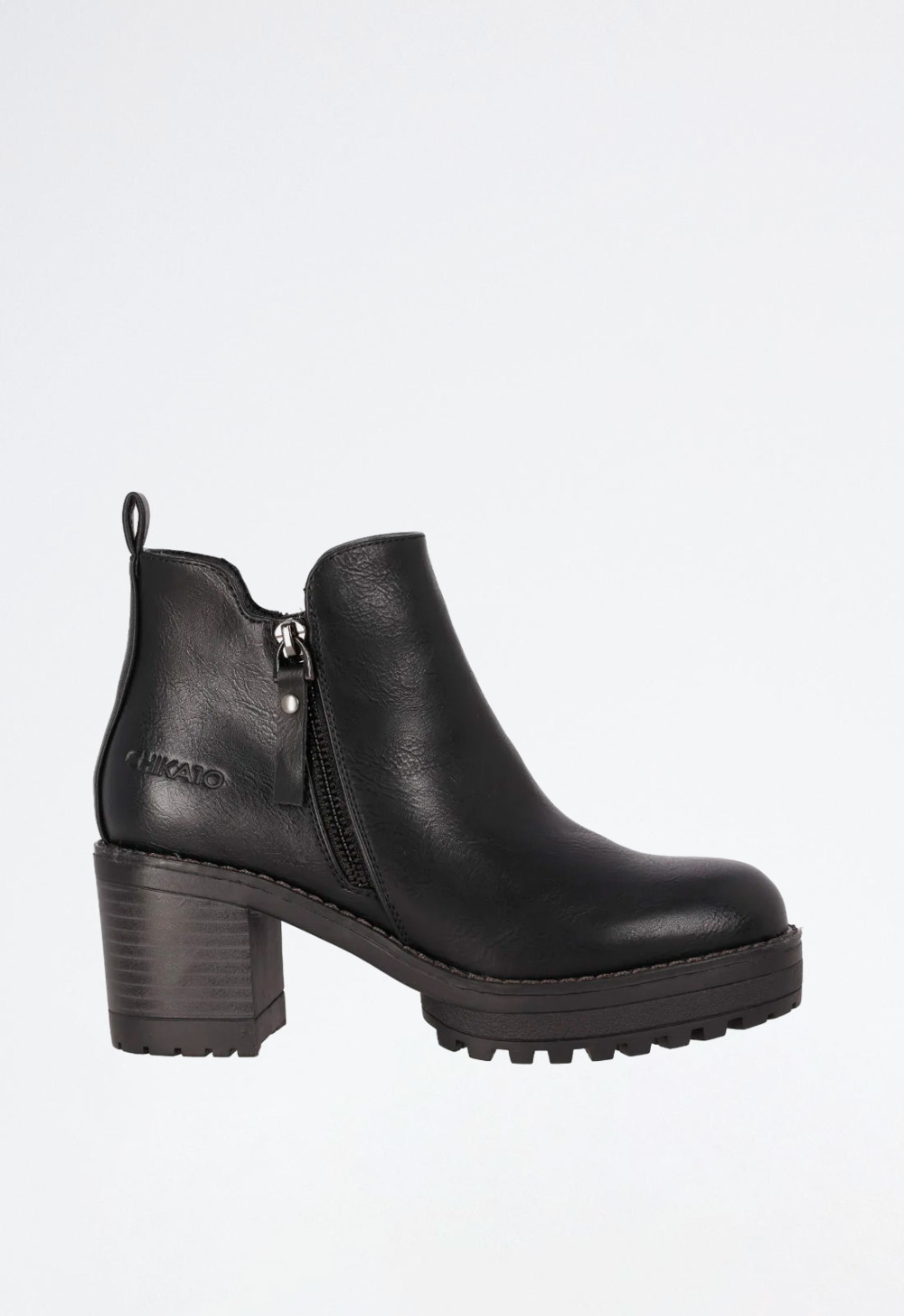 Botín de Mujer en color Negro, fabricado en Piel sintética con Plano y una altura de 7 cm.