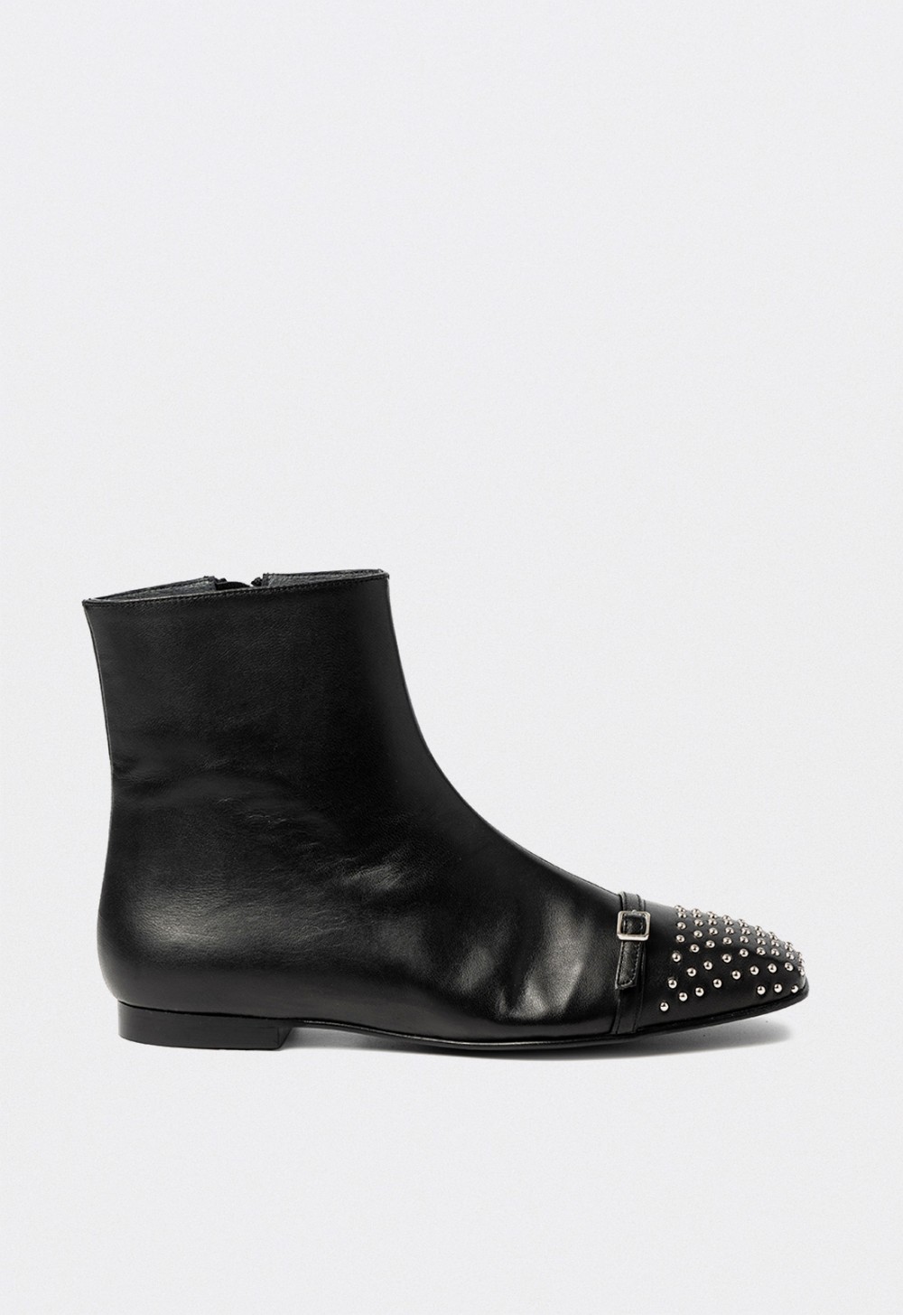 El contraste entre la suavidad de la piel y el brillo de los apliques crea un equilibrio perfecto entre sofisticación y carácter. Su cierre lateral con cremallera asegura un ajuste cómodo y práctico, mientras que la suela fina y flexible garantiza confort en el uso diario.
