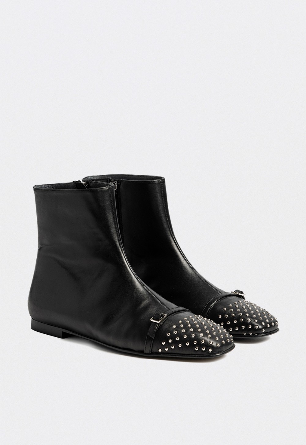 Los botines planos de Dansi en piel negra reinterpretan la elegancia clásica con un toque de rebeldía. Fabricados a mano en España con piel de alta calidad, su silueta minimalista se combina con una puntera decorada con tachuelas metálicas, que aporta personalidad y un aire contemporáneo al diseño.