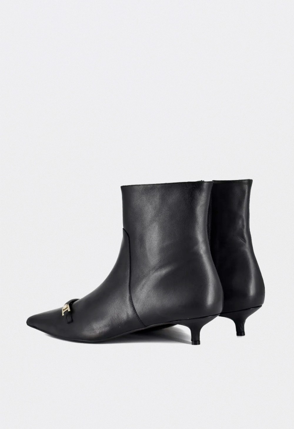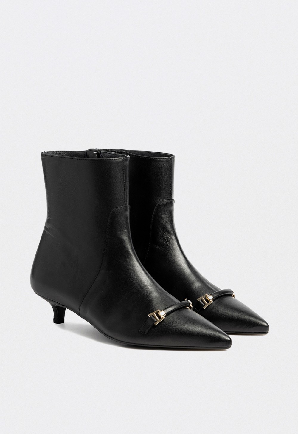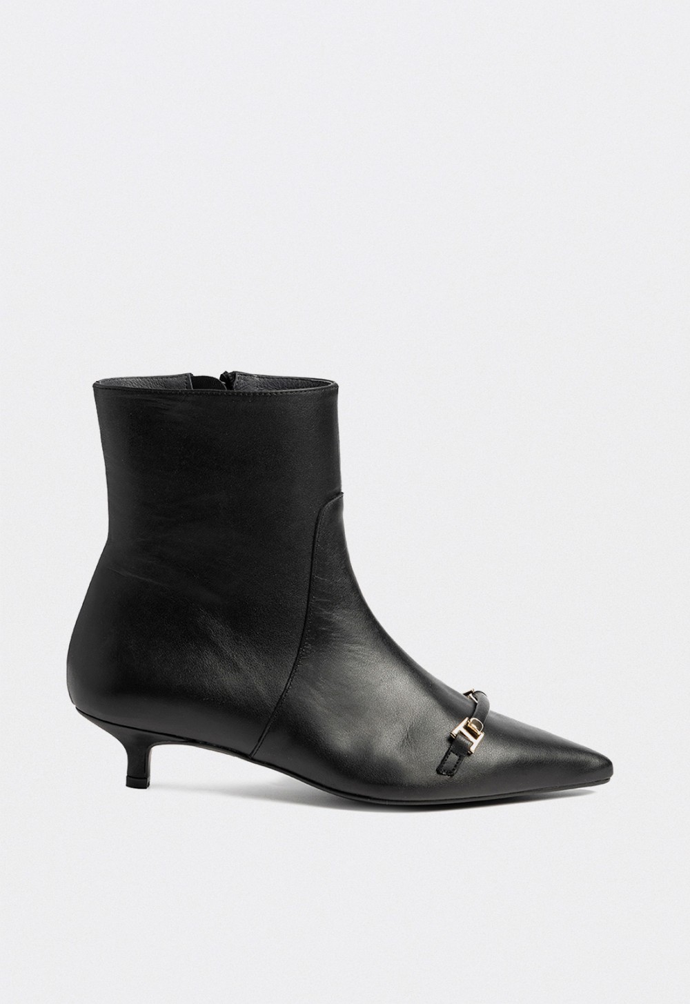 Los botines de tacón bajo Dansi reinterpretan la feminidad clásica con una silueta refinada y una elegancia natural. Confeccionados en piel premium negra, su diseño de líneas limpias y puntera afilada estiliza el pie, mientras que el detalle metálico dorado en el empeine aporta un toque de distinción y modernidad.