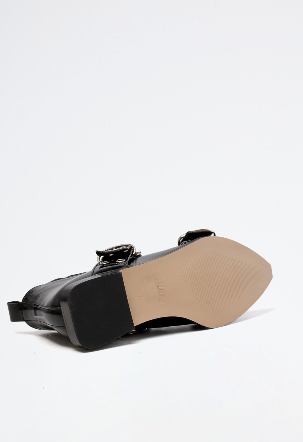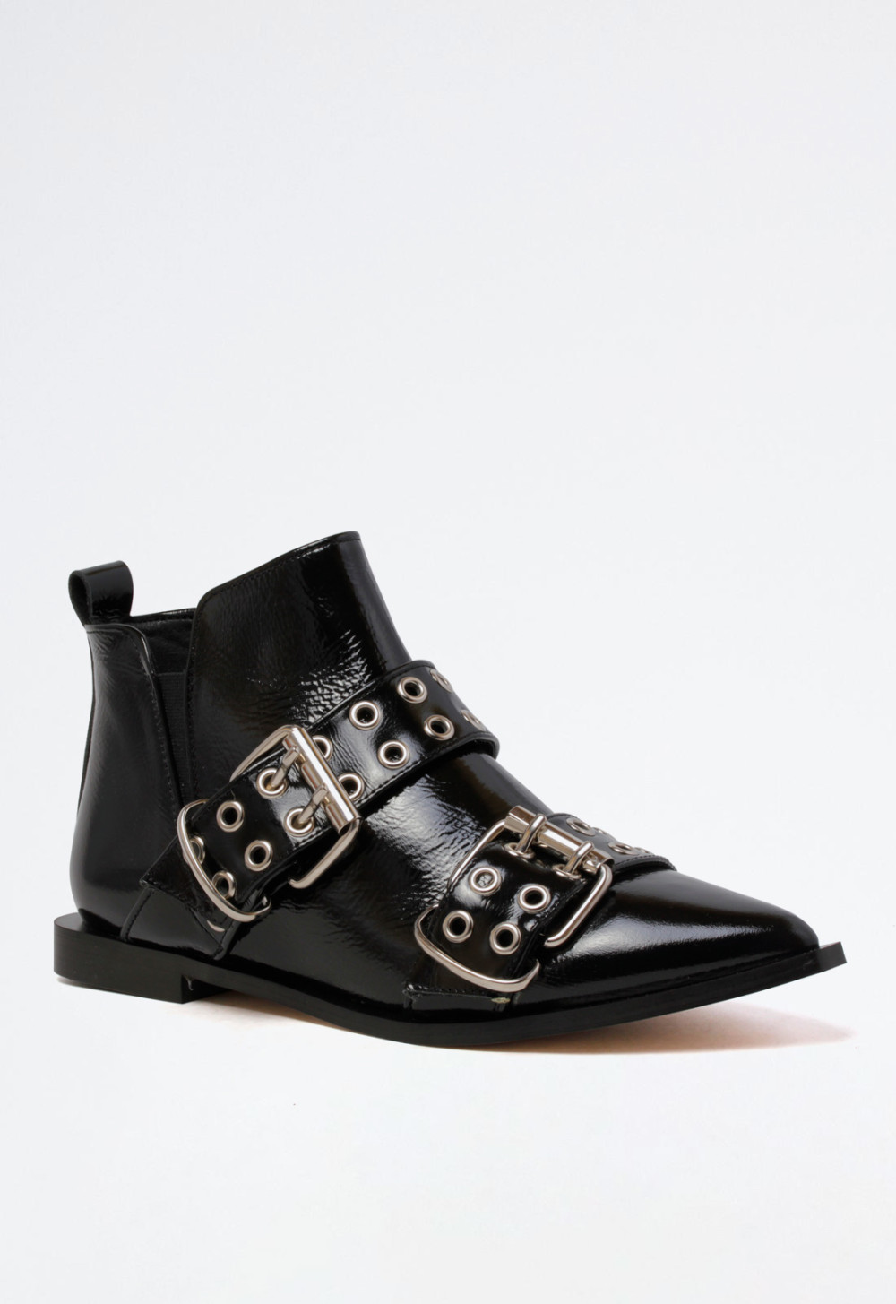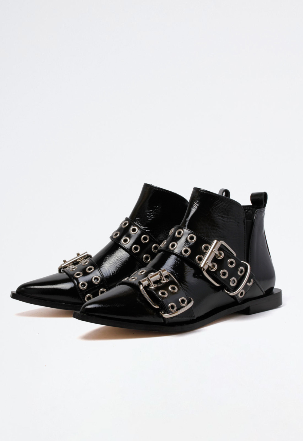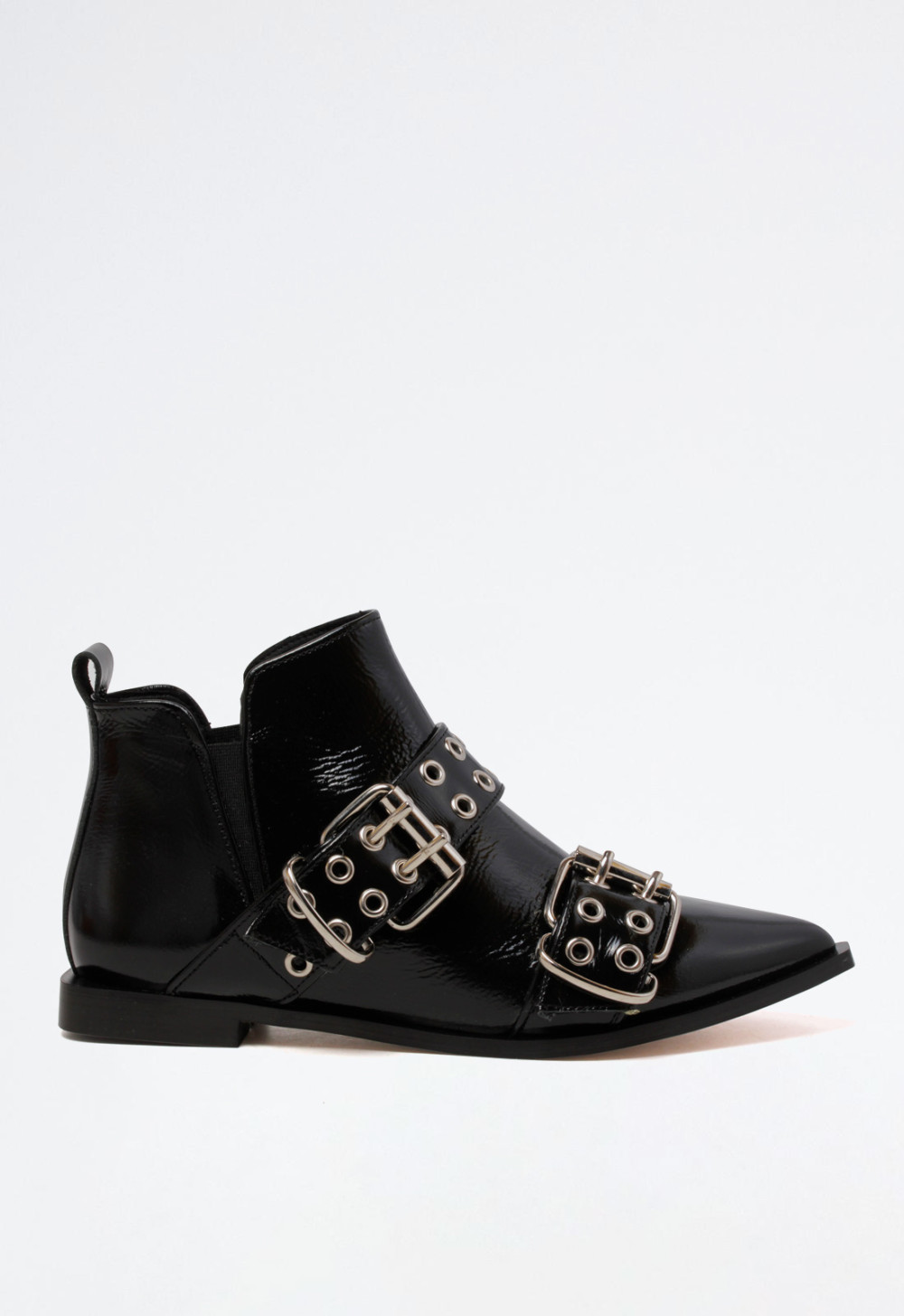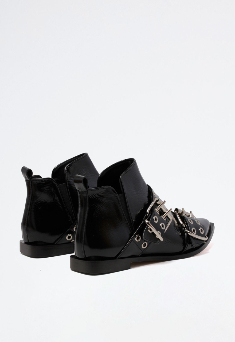 Botín de Mujer Negro de Piel con Efecto Acharolado y Hebillas Ajustables
