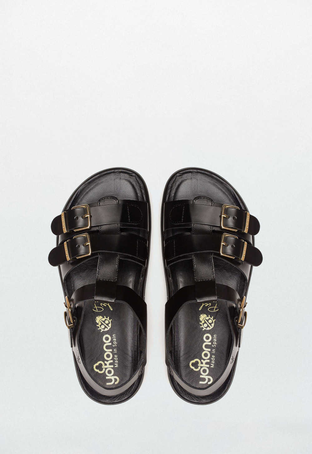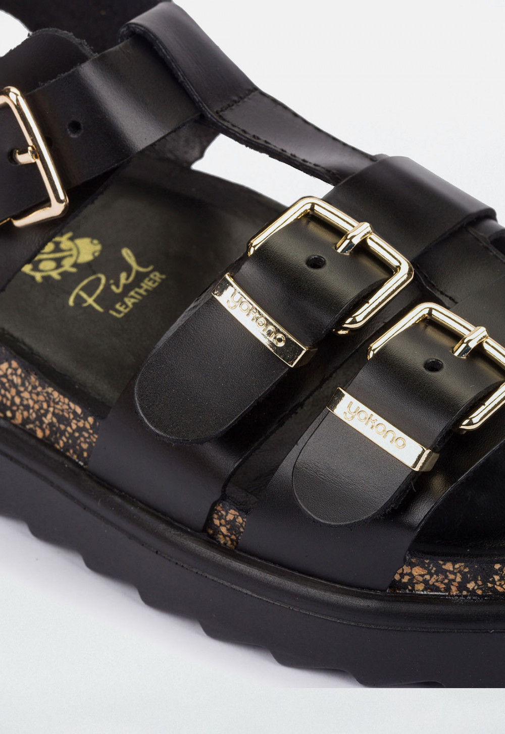 El modelo TUNEZ 114 en negro, presenta un innovador diseño pero sin perder la esencia de la línea TUNEZ, tres correas con tres hebillas doradas, piso estampado y calidad absoluta. Cuenta con una plataforma de 4 cm y una plantilla antideslizante que garantiza el agarre del pie. Está elaborado de manera artesanal en España, material de piel y uso de tintes vegetales respetuosos con el medio ambiente.