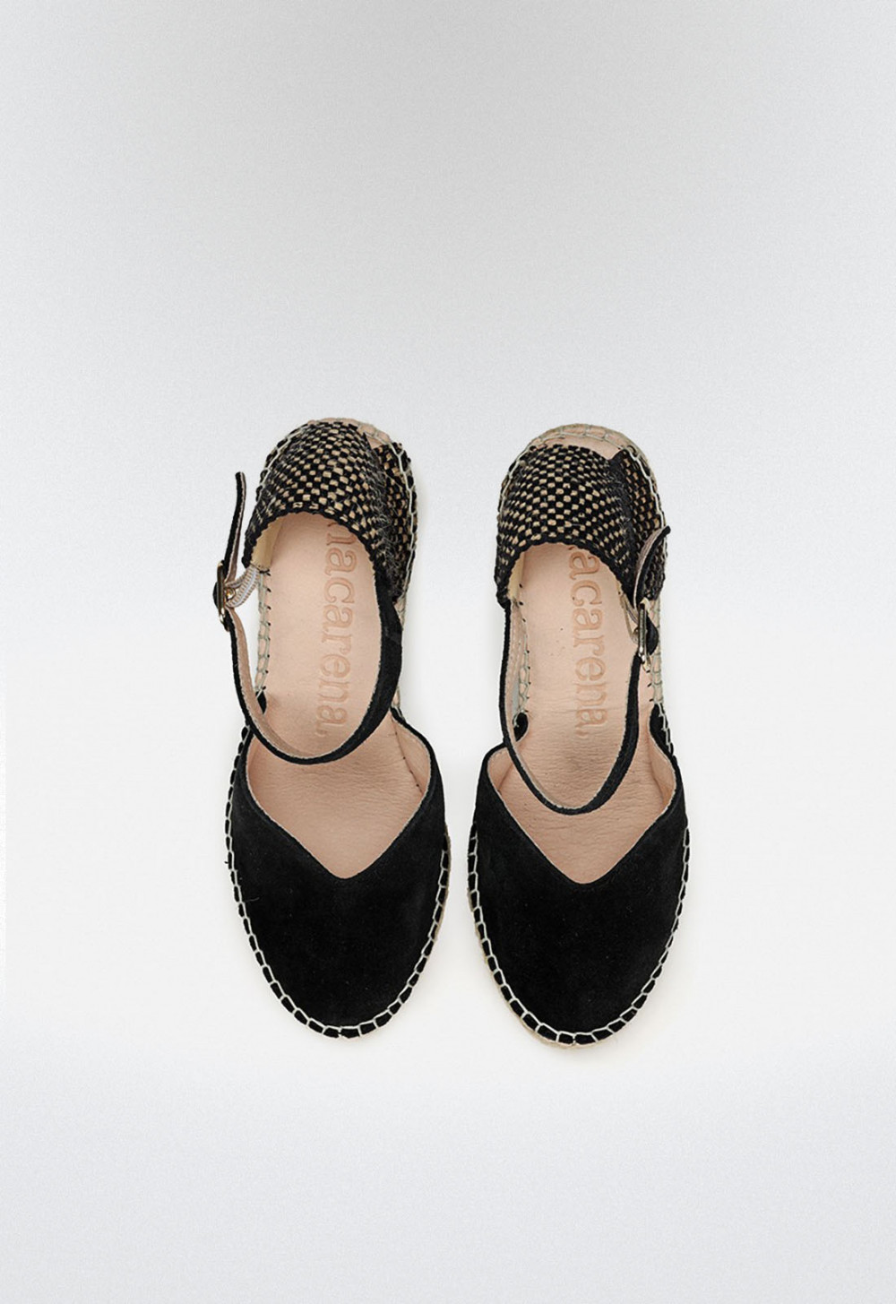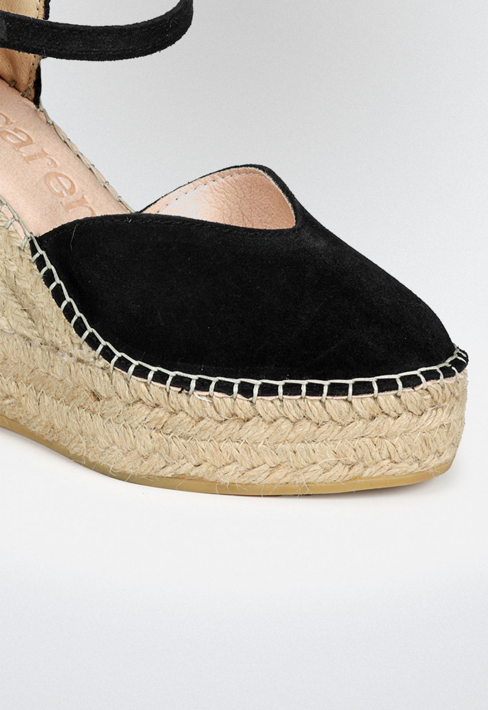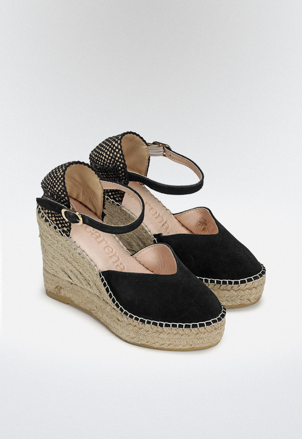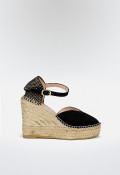 Alpargata de cuña con plataforma elaborada en serraje color negro. Cierre de pulsera con hebilla. El escote de la pala está terminado en forma de corazón, hará ver tu pie más fino y sobre todo aporta al modelo un tono más moderno.