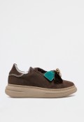 La marca italiana Meline reinventa la sneaker femenina con un diseño atrevido y lleno de carácter. Estas zapatillas de piel en color marrón se elevan con un detalle que marca la diferencia: un maxi lazo de terciopelo con aplicaciones joya, que transforma un básico urbano en una pieza sofisticada y única.