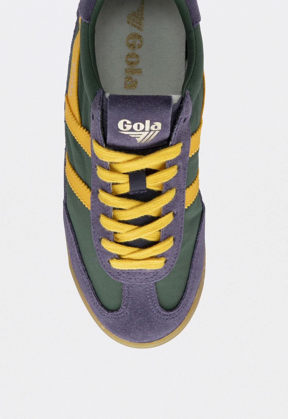 Las Gola Classics Firefly son una oda al color y a la energía vintage. Este modelo para mujer combina tonos evergreen, ciruela y amarillo sol, creando una zapatilla única que eleva cualquier look casual con un aire desenfadado y moderno. Su diseño recupera la estética retro deportiva de Gola, reinterpretada con materiales actuales como el nylon vintage y paneles de serraje suave, que aportan textura y contraste.