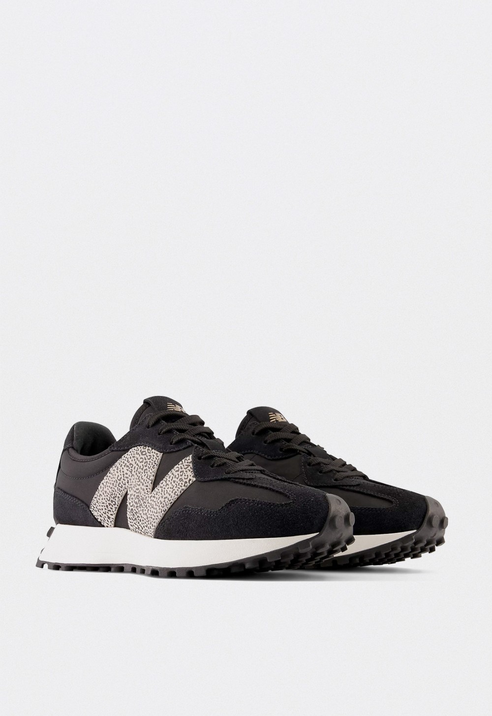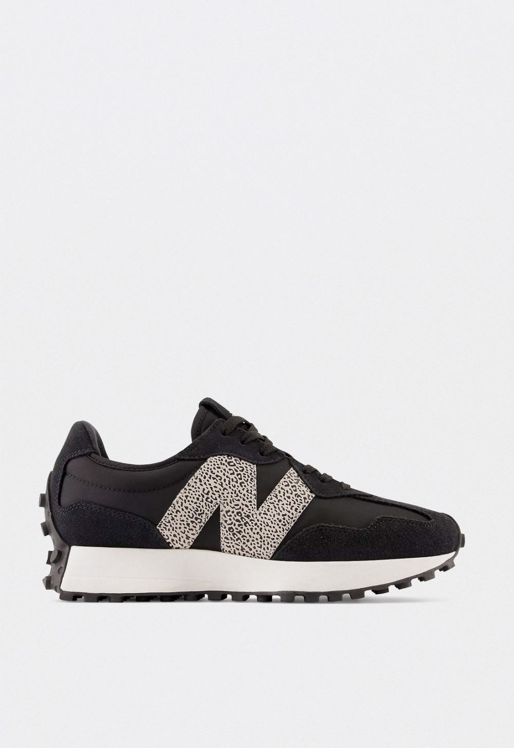 Las New Balance 327 negras para mujer reinterpretan el legado del running de los años 70 con una estética contemporánea y atrevida. Inspiradas en los icónicos modelos 320, 355 y Supercomp, estas zapatillas combinan líneas angulosas, un perfil dinámico y una gran “N” lateral con estampado animal print, que aporta un toque fashion y moderno.