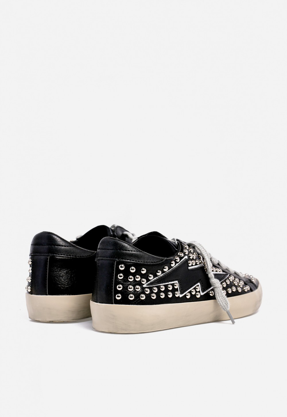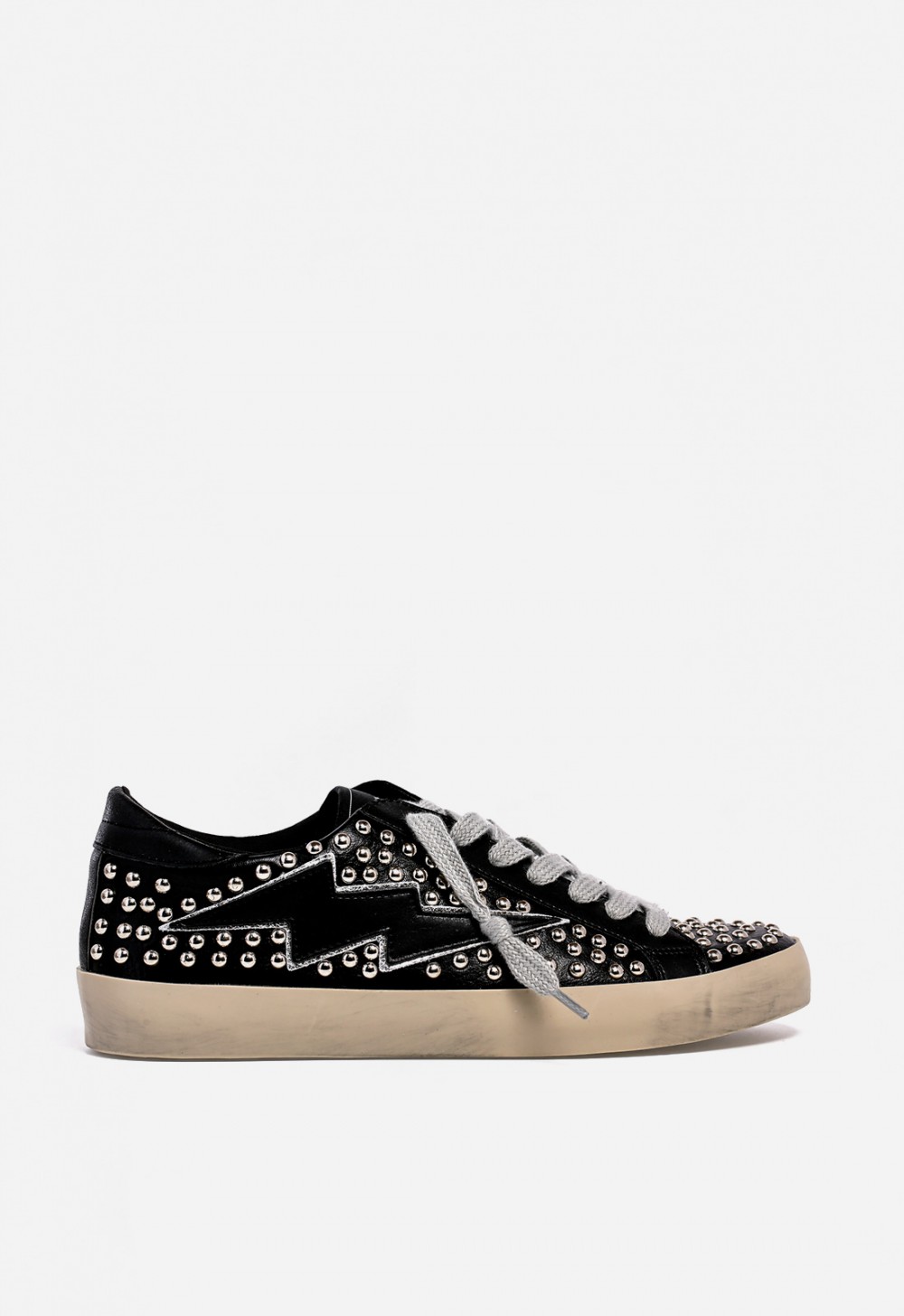 Zapatilla WHY PINK? M5501 de mujer en polipiel negra con tachuelas y diseño de rayo. Estilo urbano con suela envejecida y cordones en contraste.