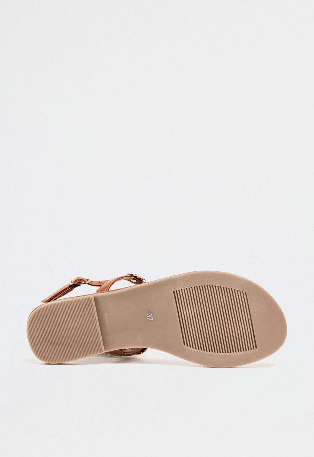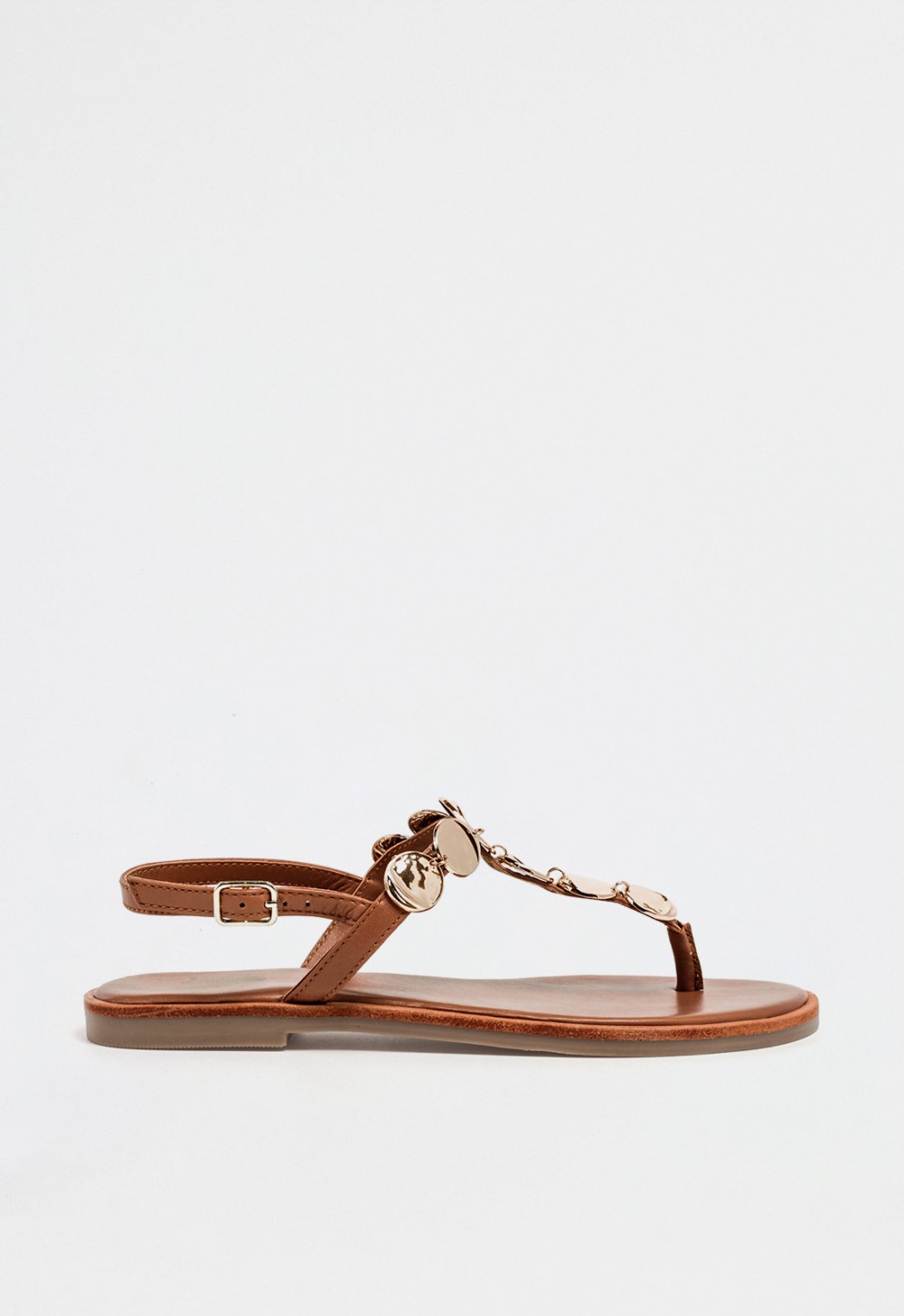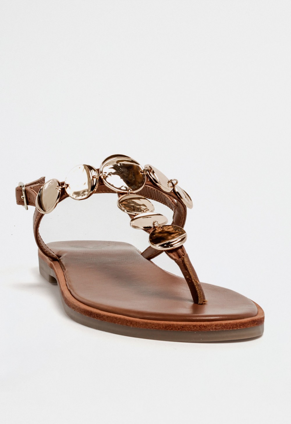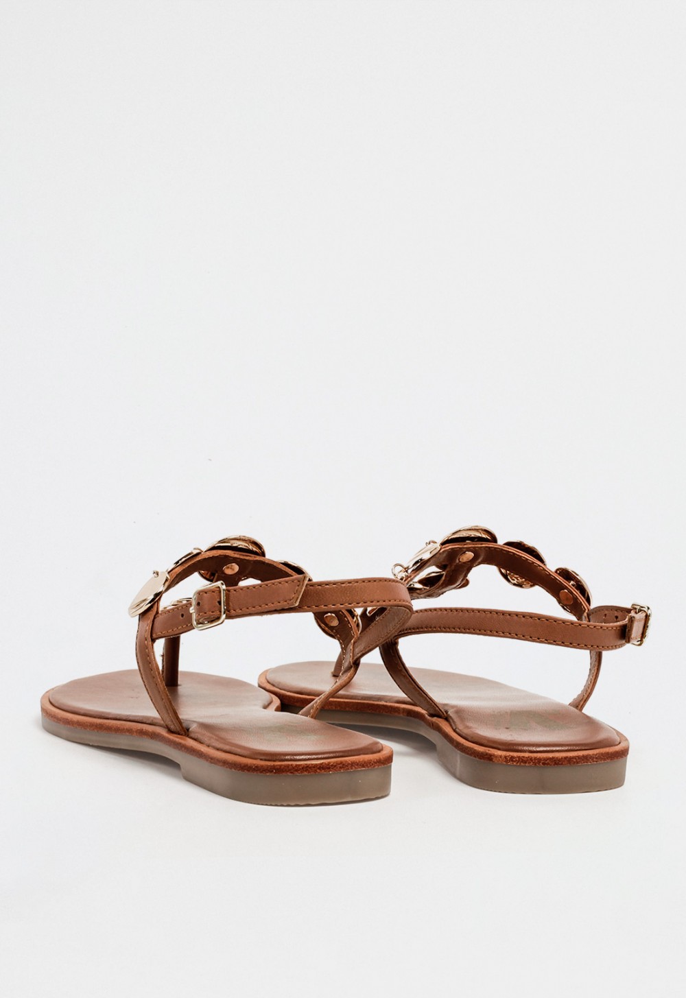 En esta versión en piel color cuero, la sandalia plana mantiene su equilibrio perfecto entre sencillez y detalle. Las tiras delanteras están adornadas con pequeños apliques metálicos dorados, que aportan luz y calidez al diseño, reforzando su estética natural y refinada.