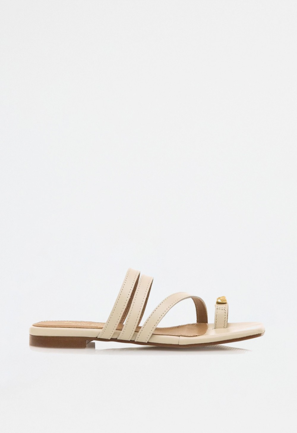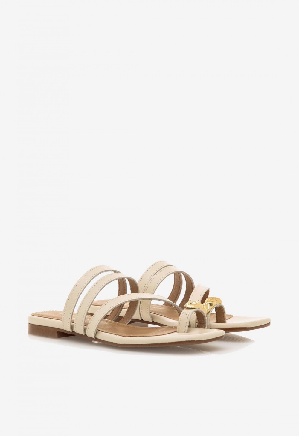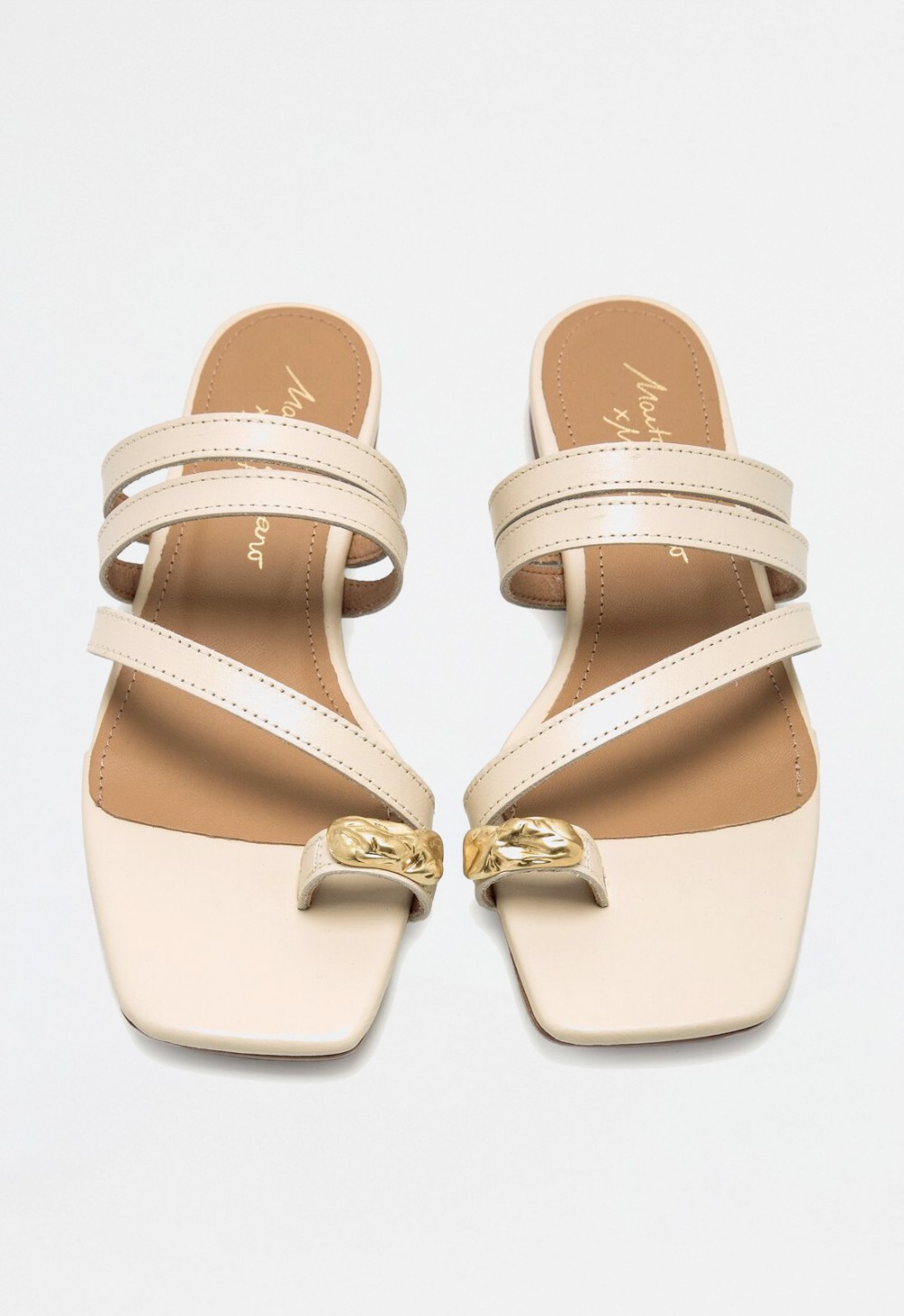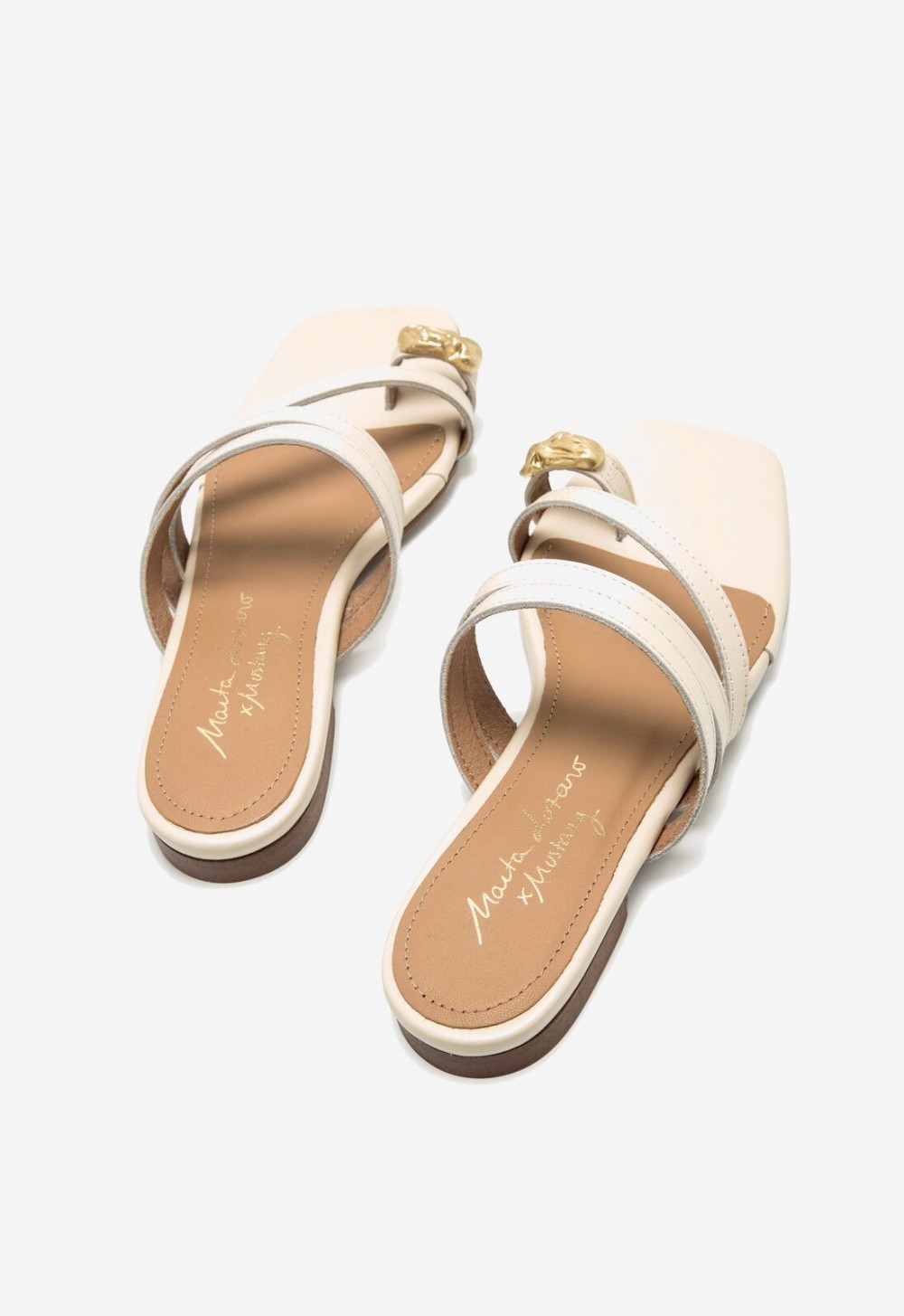 La sandalia NECANE en piel color hielo es fruto de la colaboración exclusiva entre Mustang y la influencer Marta Lozano, una pieza que combina moda, comodidad y sofisticación. Su diseño plano con tiras finas abiertas realza la silueta del pie, mientras que la pieza dorada artesanal en el dedo añade un toque moderno y refinado.