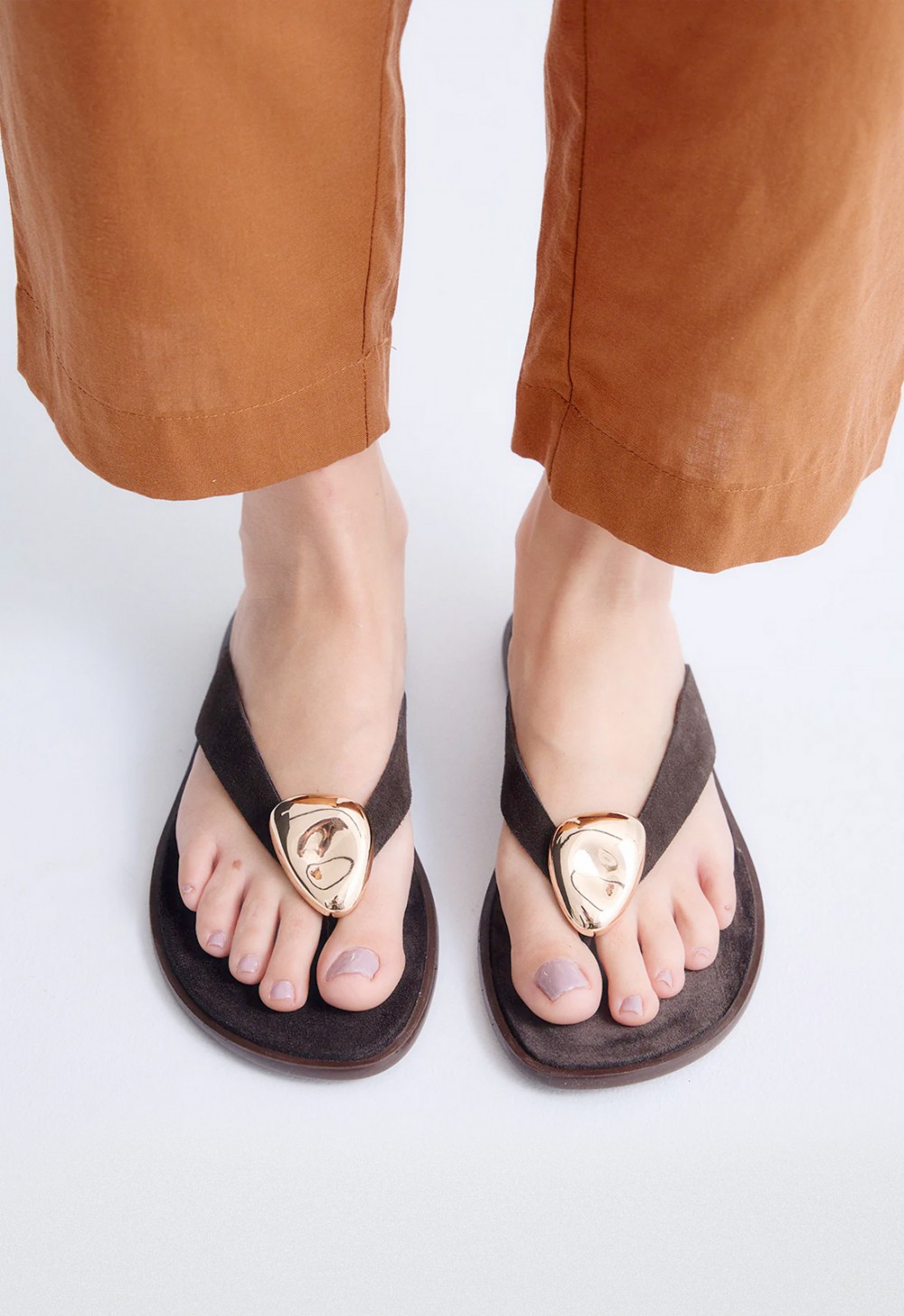 La sandalia plana de mujer EXE 566 Zizel Suede Brown combina la naturalidad del color marrón con un detalle dorado que aporta luz y sofisticación. Su diseño tipo dedo estiliza el pie con un aire minimalista y muy chic, perfecto para elevar looks de verano sin renunciar a la comodidad. Fabricada en cuero, con plantilla también de cuero, es una opción versátil para combinar con vestidos fluidos, pantalones lino o conjuntos casual elegantes. Una sandalia sencilla, cómoda y con ese toque joya que marca la diferencia.