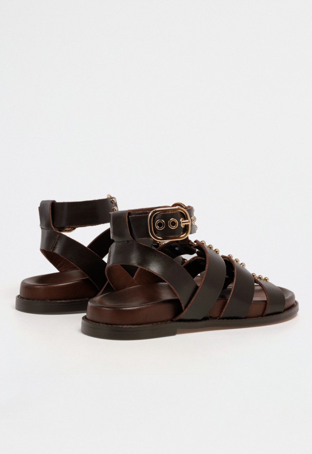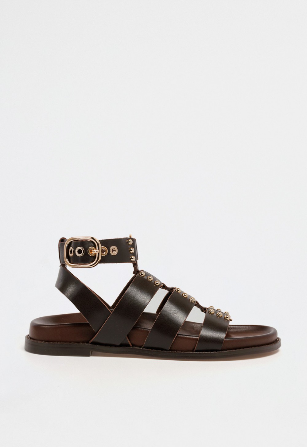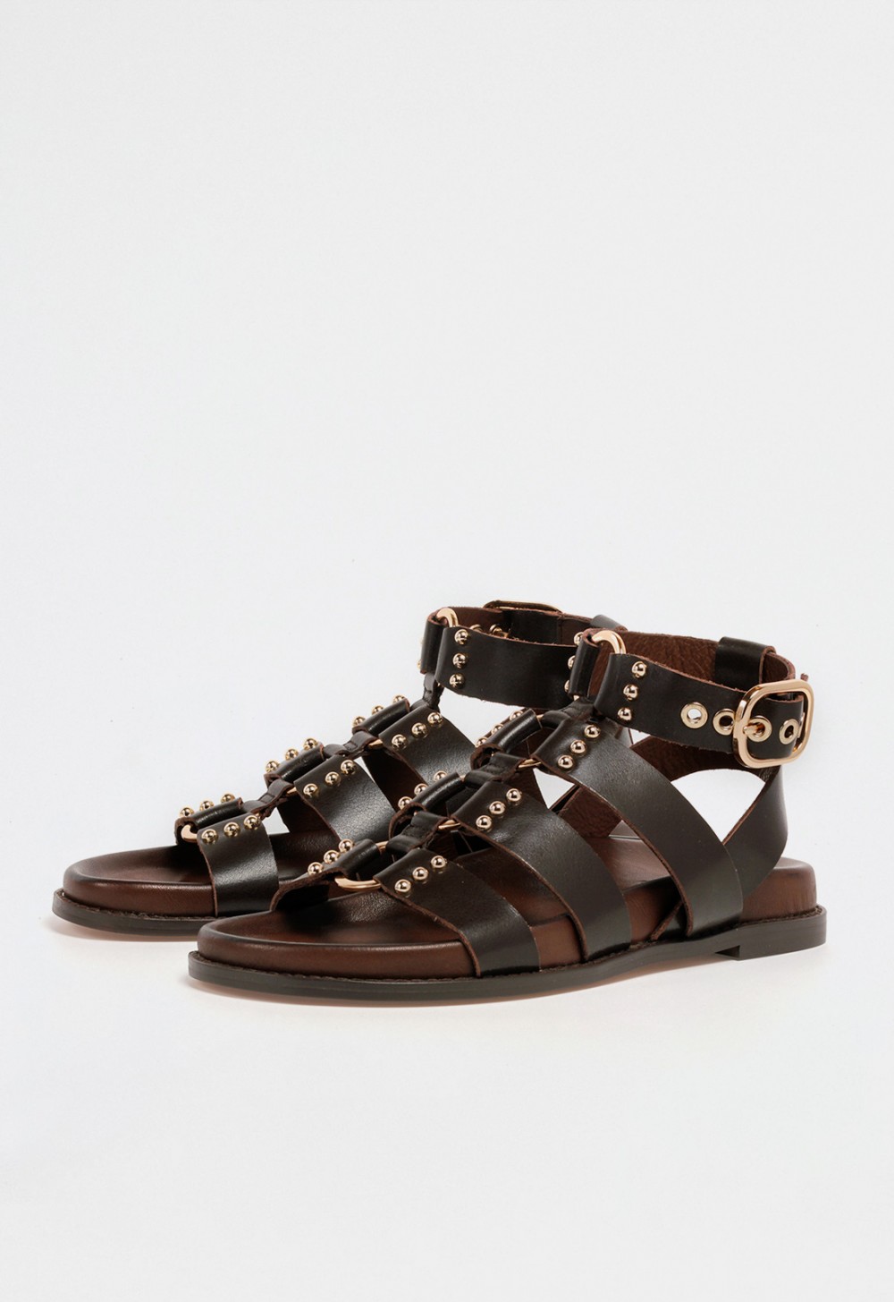 Inspirada en la fuerza del estilo clásico, esta sandalia plana de mujer tipo romana combina estructura, carácter y sofisticación. Confeccionada en piel marrón, presenta múltiples tiras que cubren el empeine y suben hasta el tobillo, donde se ajustan mediante una pulsera con hebilla dorada. Las pequeñas tachuelas metálicas aportan un toque brillante que eleva el conjunto sin sobrecargarlo.