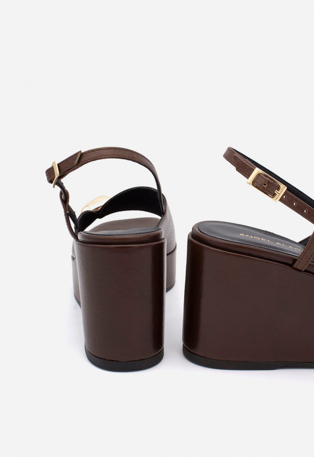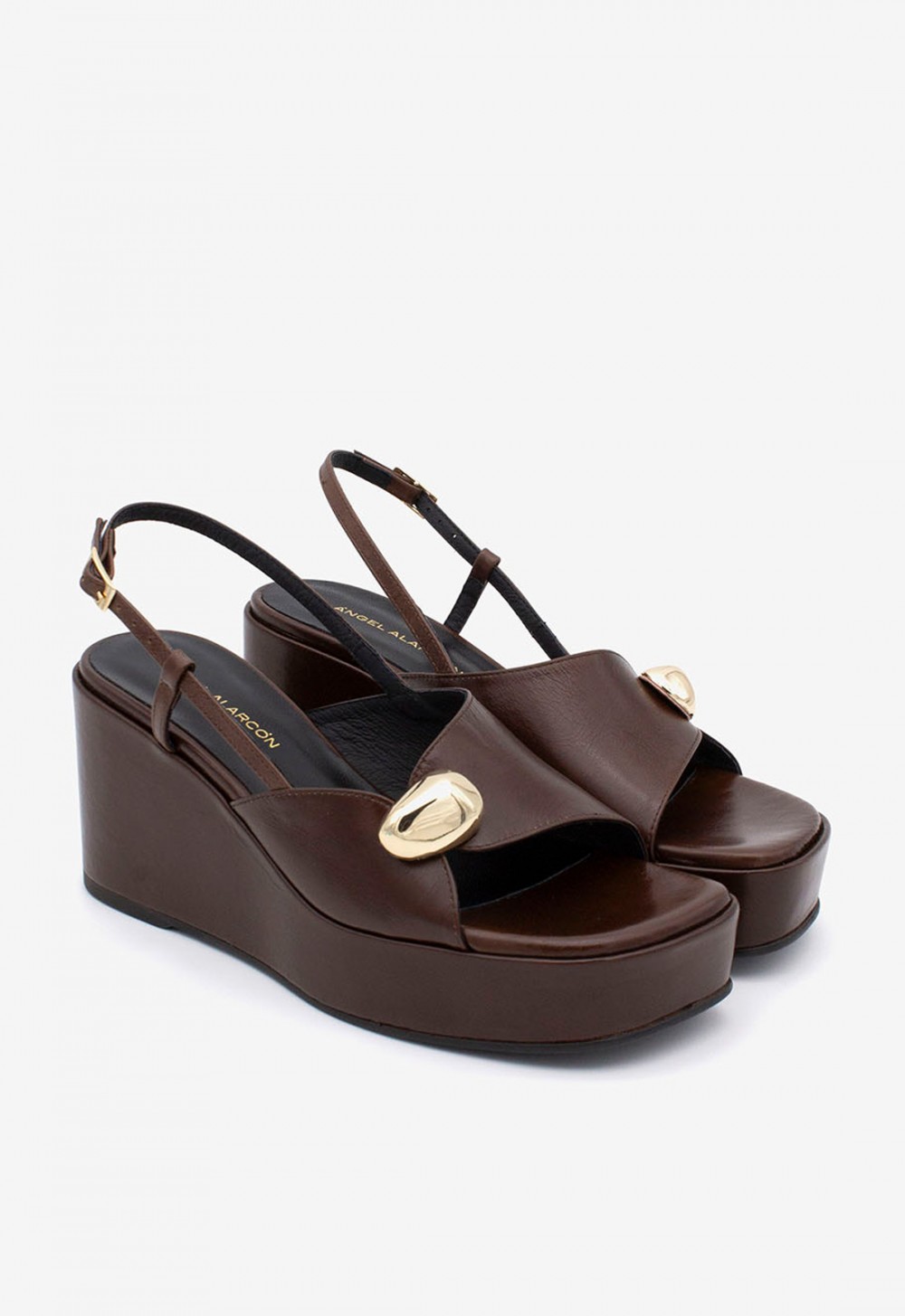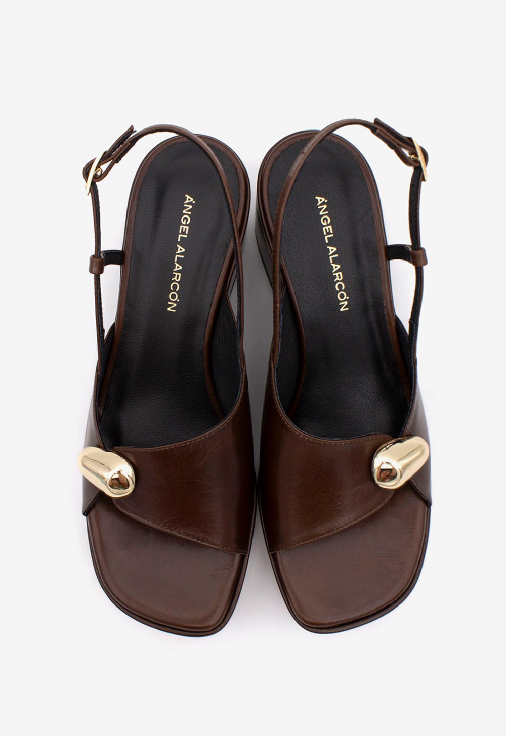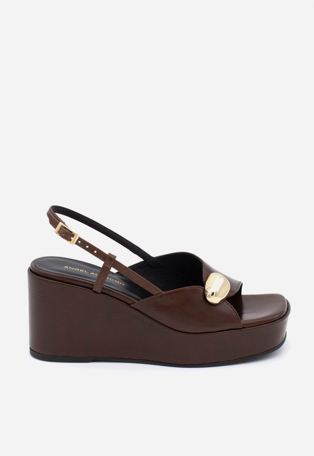 La sandalia de mujer 26086-400R de Ángel Alarcón destaca por su diseño sofisticado en color moka y su acabado en piel, ideal para ocasiones especiales. Su silueta de cuña con plataforma estiliza la figura y aporta una pisada más cómoda y estable, mientras que la puntera abierta y la tira trasera con hebilla aseguran un ajuste femenino y favorecedor. El detalle metálico dorado en el empeine eleva el look con un toque elegante y actual. Perfecta para invitadas, cenas, celebraciones o estilismos de vestir con vestidos, faldas y pantalones fluidos.