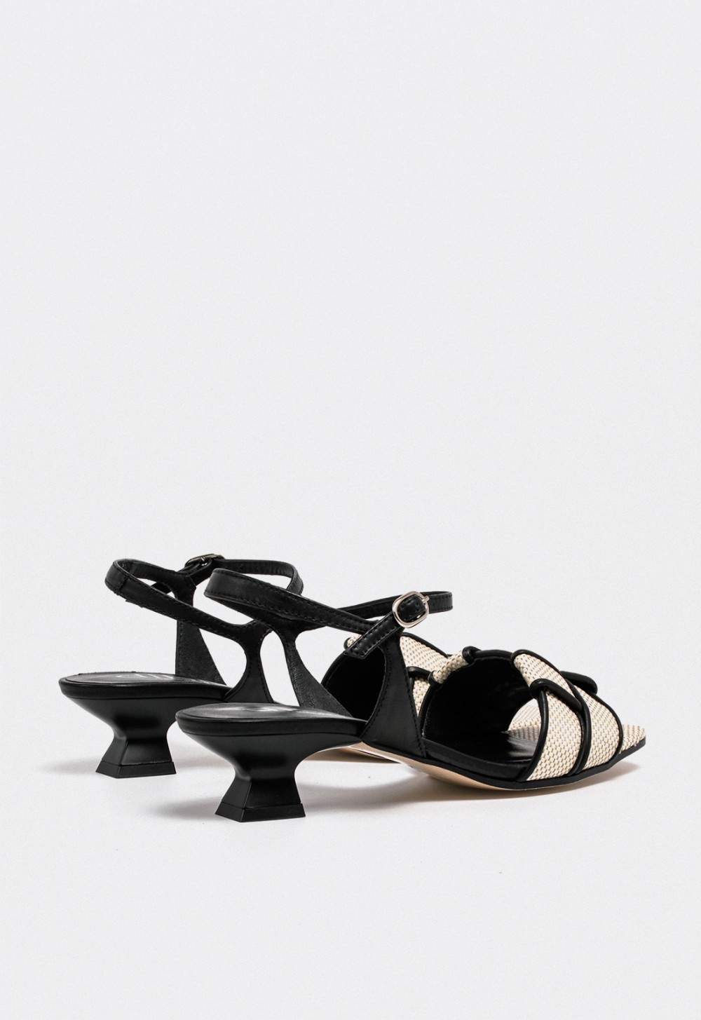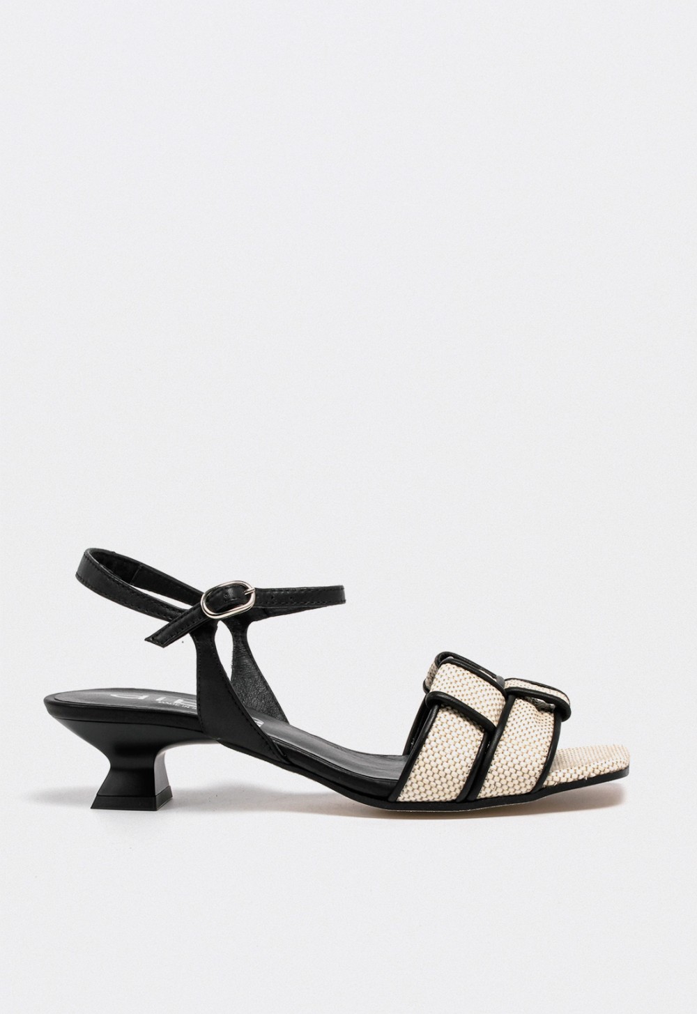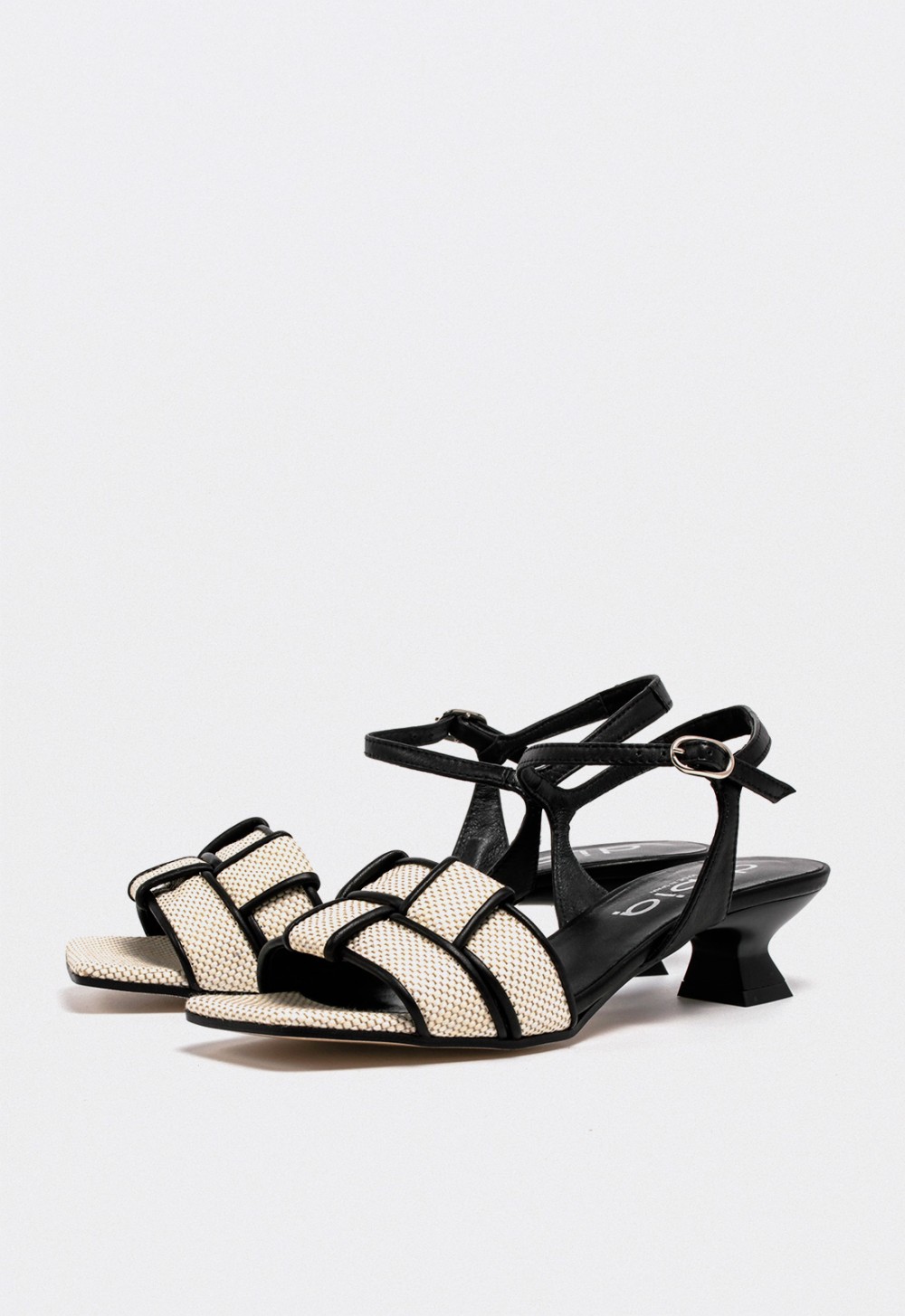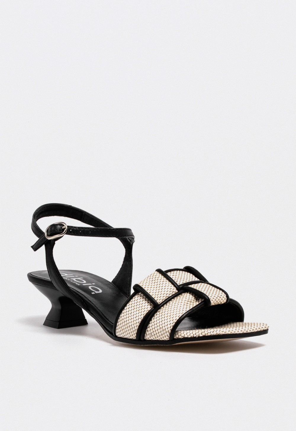 Diseñada para mujeres que buscan estilo con un punto artístico y urbano, esta sandalia de tacón bajo combina líneas arquitectónicas con materiales frescos. El contraste entre las tiras trenzadas en blanco roto y los bordes en negro resalta su estructura cuidada y contemporánea. La pulsera al tobillo estiliza la silueta y asegura un ajuste cómodo. Ideal para elevar looks casuales o completar outfits más refinados sin renunciar al confort.
