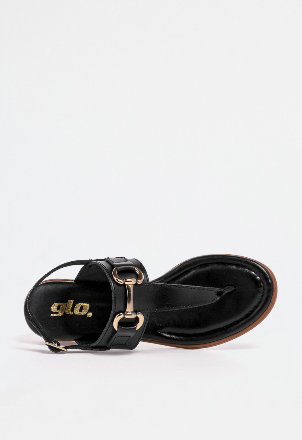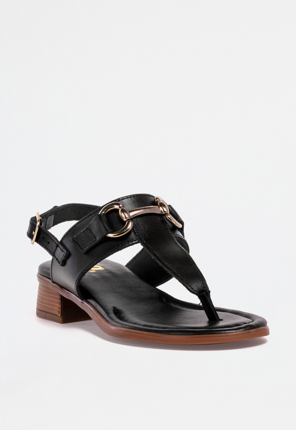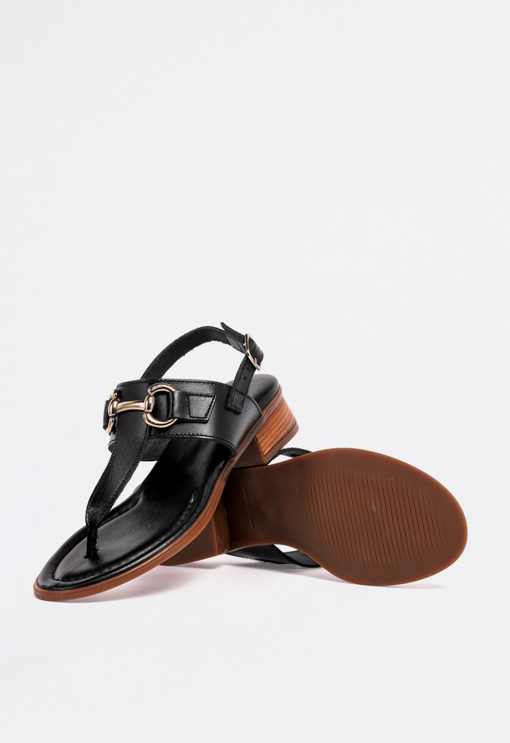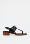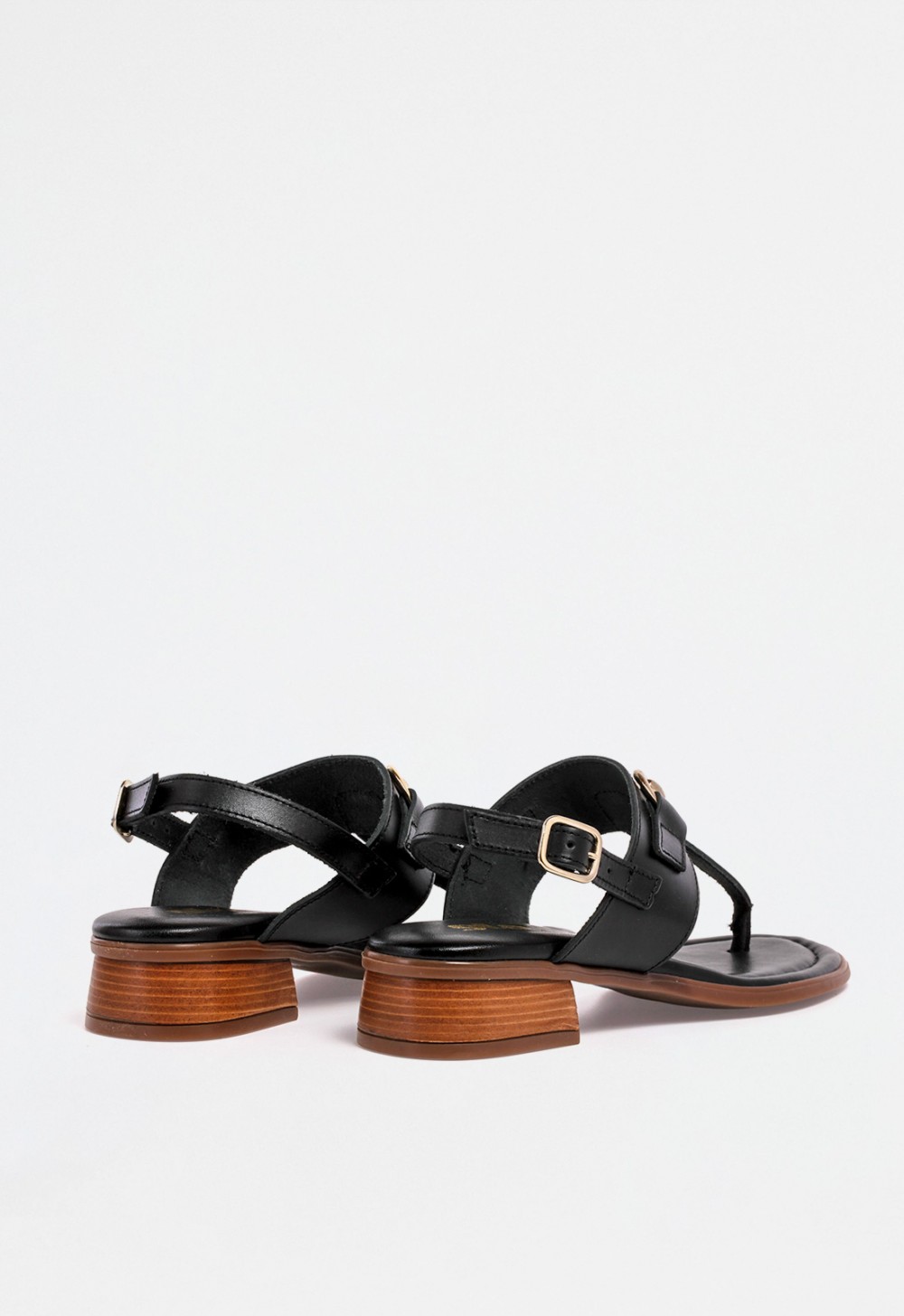 Sandalia de mujer en color negro, confeccionada en piel y con cuña media que estiliza sin renunciar a la comodidad. Su diseño tipo dedo incorpora un elegante broche doble en tono dorado sobre el empeine, aportando un toque distintivo y refinado. El cierre trasero con tira y hebilla dorada asegura una sujeción cómoda y favorecedora.