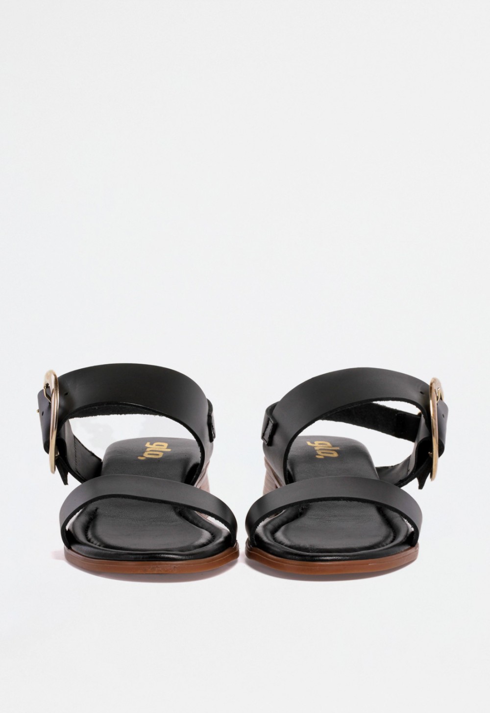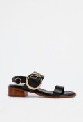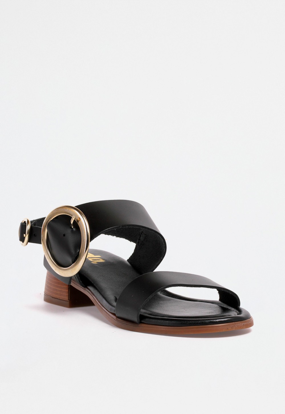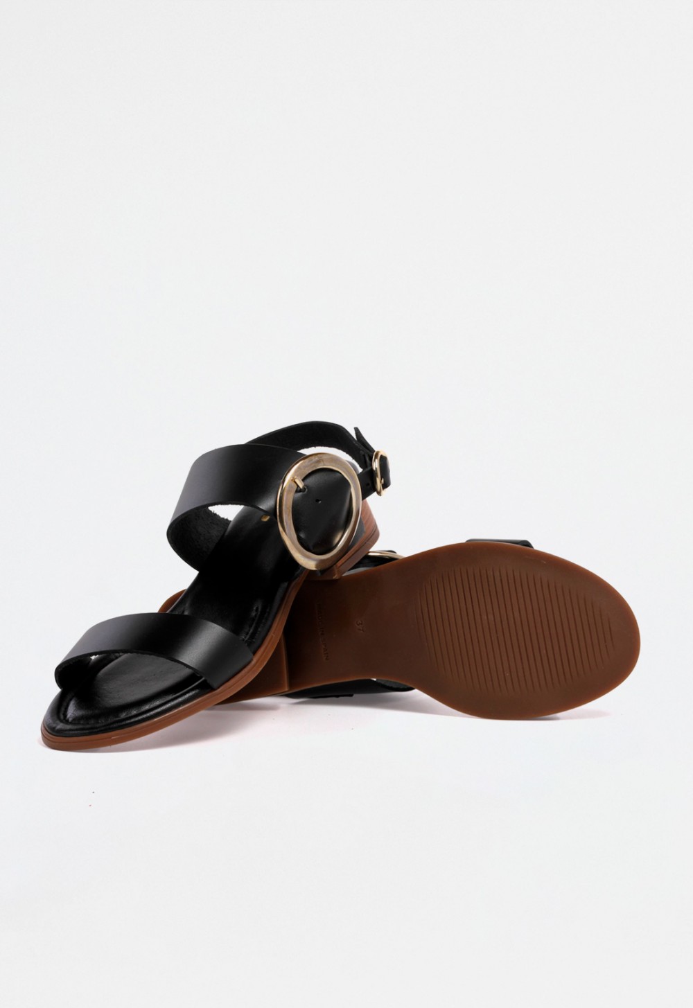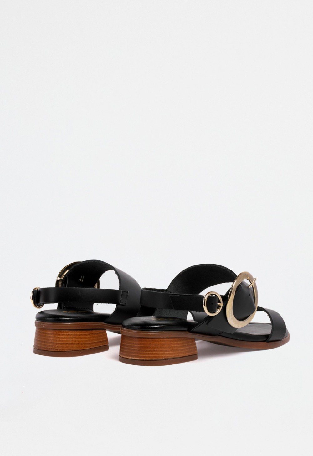 Sandalia de mujer en color negro con cuña media, diseñada con una combinación de tiras que aportan estructura y atractivo visual. En la parte delantera, una tira estrecha realza el pie con sutileza, mientras que una tira ancha en el empeine incorpora una gran hebilla circular dorada en el lateral, creando un punto focal sofisticado. La parte trasera incluye una tira fina con otra hebilla dorada más pequeña para un ajuste cómodo y seguro.