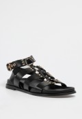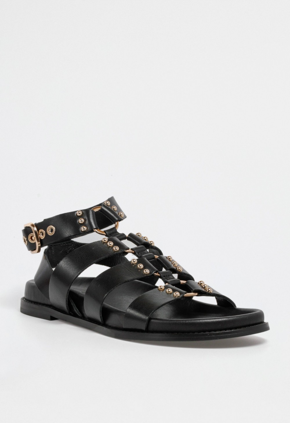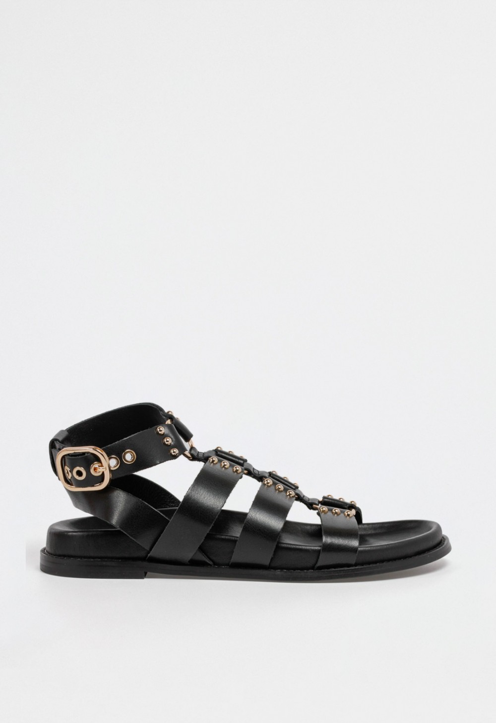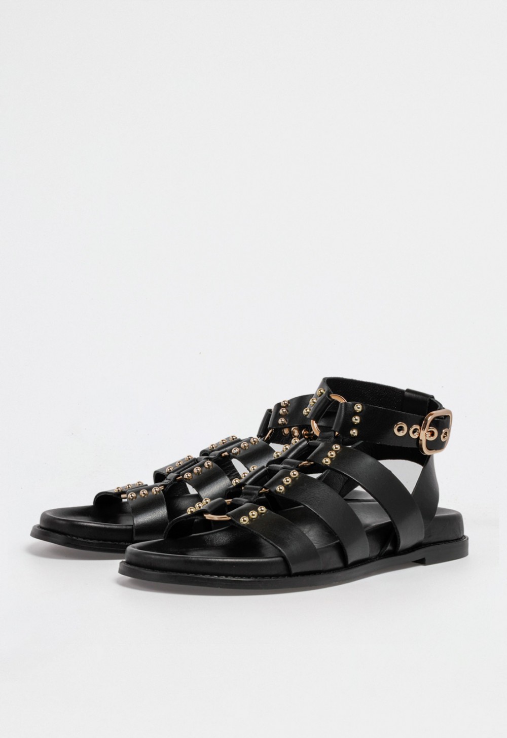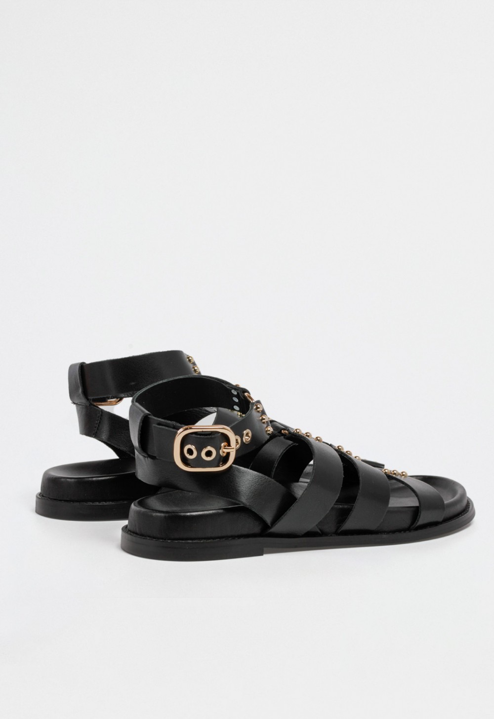 Con una estética poderosa y estructura envolvente, esta sandalia plana de mujer reinterpreta el estilo romano con un toque contemporáneo. Fabricada en piel negra de acabado liso, presenta varias tiras que recorren el empeine y se unen mediante anillas doradas, adornadas con pequeñas tachuelas metálicas que aportan carácter y dinamismo.