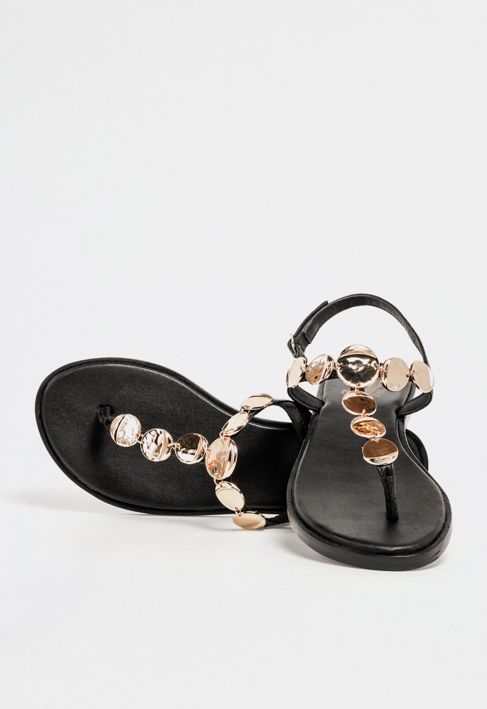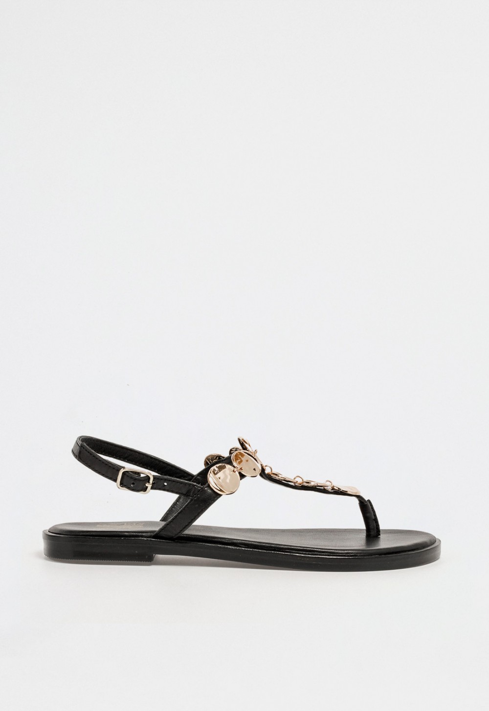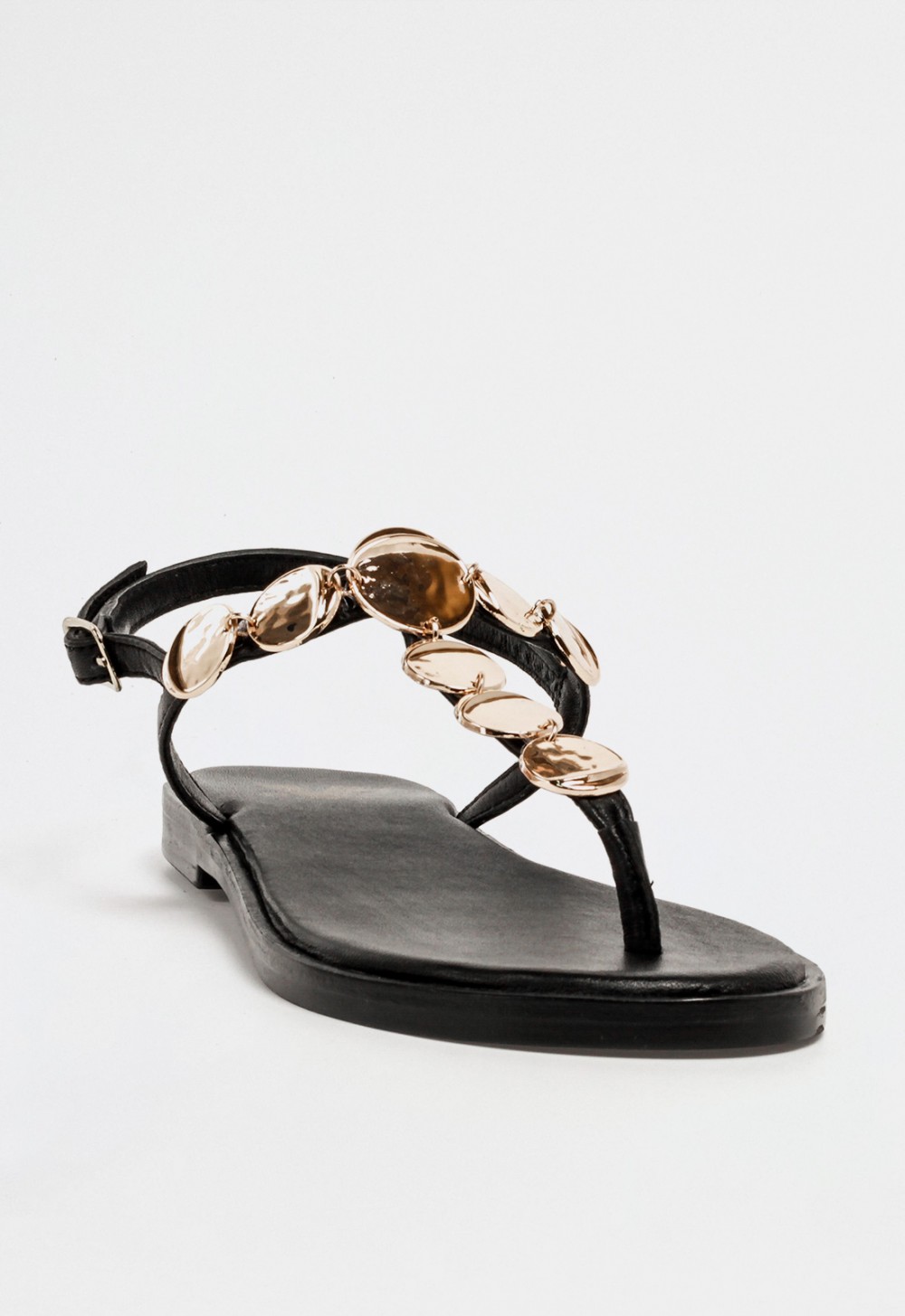 Esta sandalia plana de piel negra fusiona sencillez estructural con detalles dorados que elevan el diseño. Las tiras delanteras incorporan pequeños adornos metálicos en acabado dorado, aportando luz y un toque refinado que se integra con naturalidad en estilismos urbanos o sofisticados.