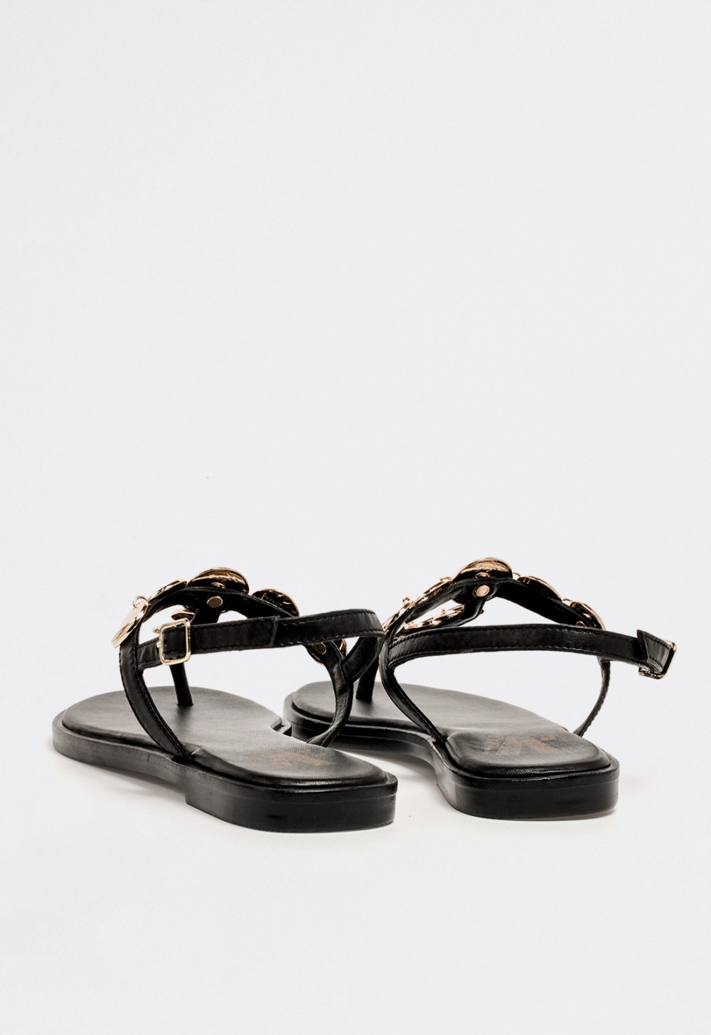 Piel negra con tiras delanteras decoradas con detalles metálicos dorados