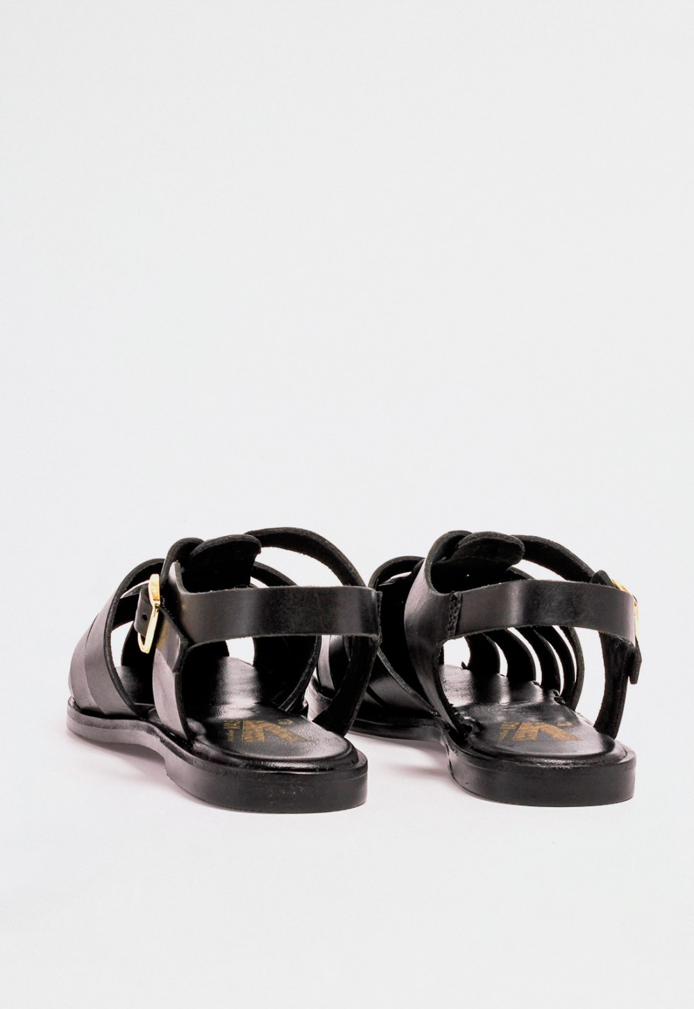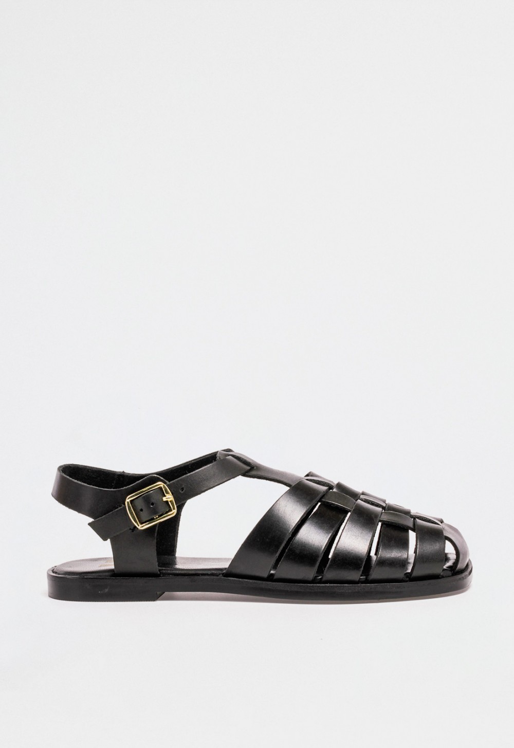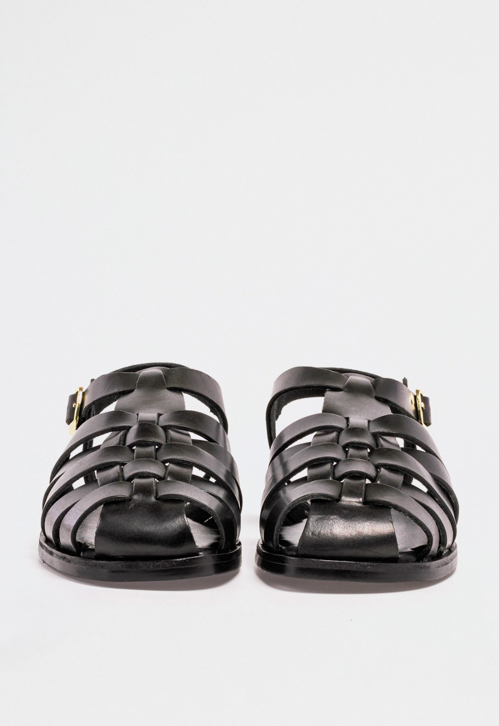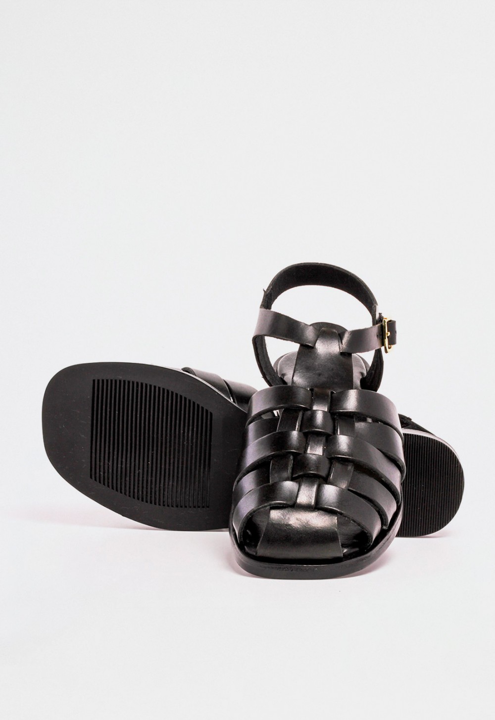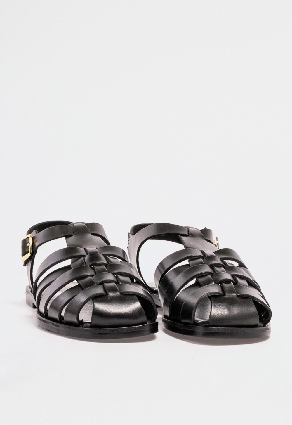 Inspirada en la clásica silueta cangrejera, esta sandalia plana de piel negra ofrece una reinterpretación moderna y refinada. Su diseño trenzado cubre el empeine con elegancia y estructura, aportando sujeción sin sacrificar ligereza ni frescura. La pulsera lateral con hebilla metálica dorada permite un ajuste seguro y estilizado.