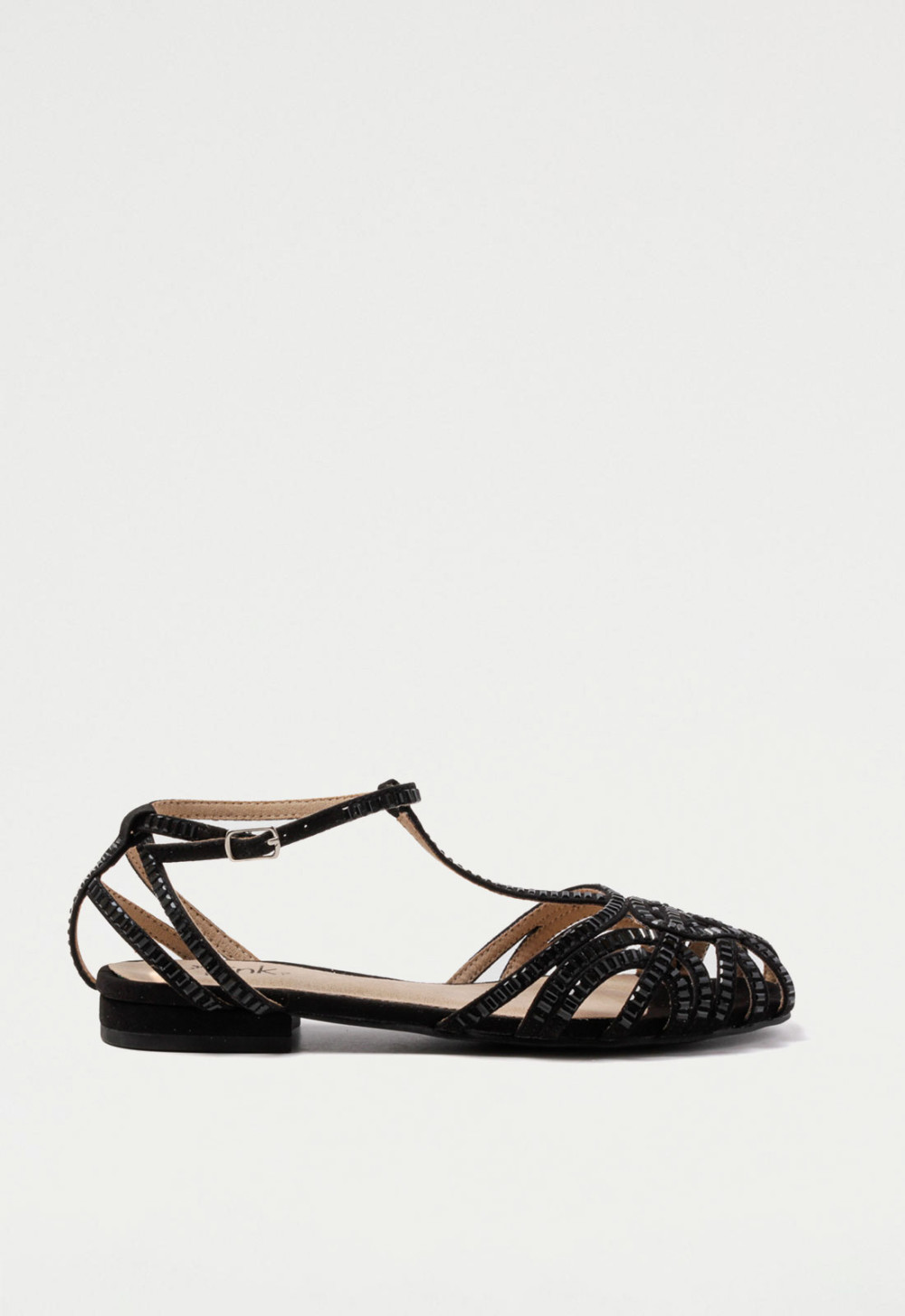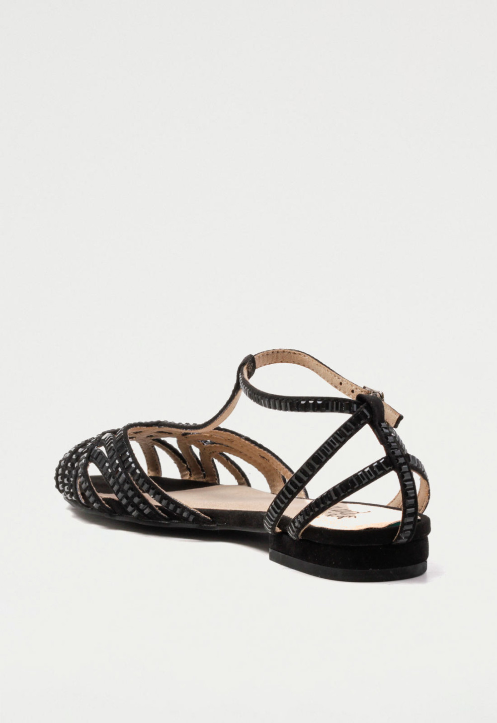 Diseñada para destacar, esta sandalia plana de mujer estilo cangrejera es la fusión perfecta entre funcionalidad y estilo. En color negro, con tiras que abrazan el pie y adornadas con pedrería decorativa, es una opción elegante y cómoda para el día o la noche.