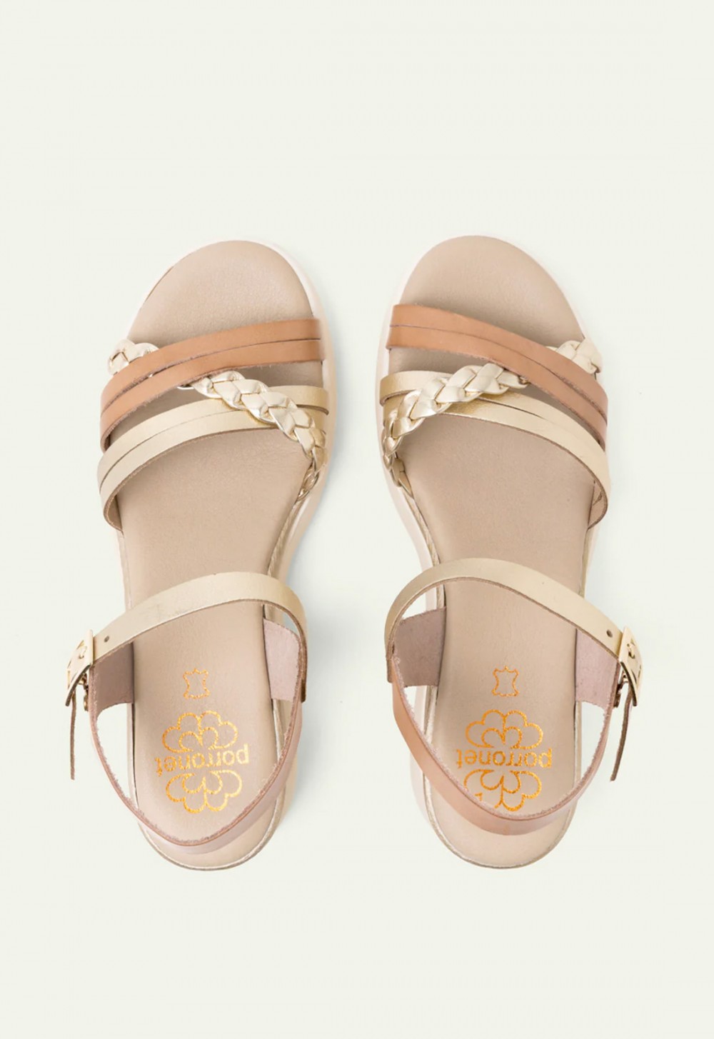 Las sandalias de cuña Porronet Emma en tono taupe oro son la opción perfecta para ganar altura sin renunciar a la comodidad. Fabricadas artesanalmente en España en piel de alta calidad, combinan tiras cruzadas que estilizan el pie con un diseño versátil y elegante. Incorporan cierre ajustable con hebilla para un ajuste seguro y una plantilla acolchada que proporciona confort durante todo el día. Su cuña de 5 cm con plataforma de 2 cm ofrece una pisada estable y ligera, ideal para el uso diario. Un modelo perfecto para looks casual y más arreglados en verano.