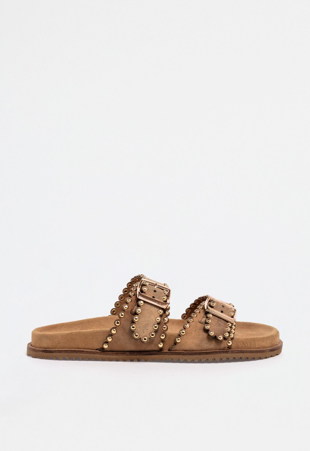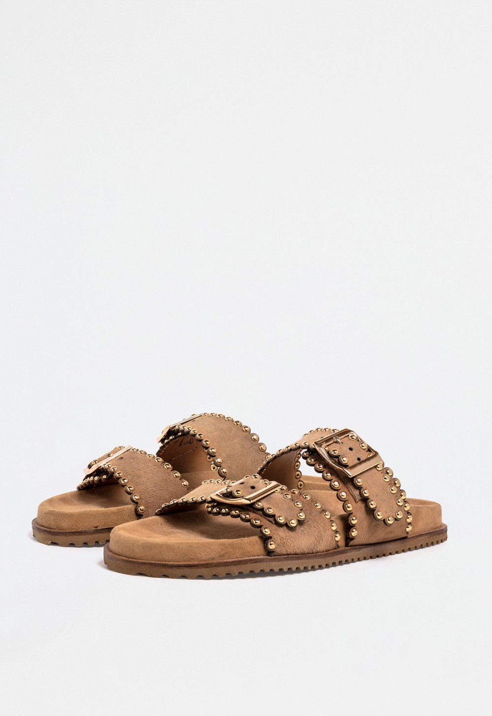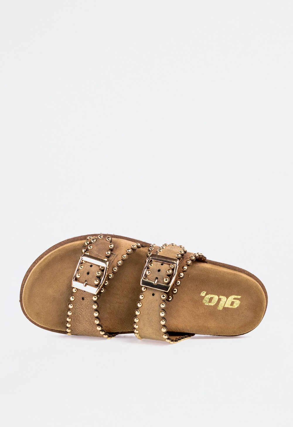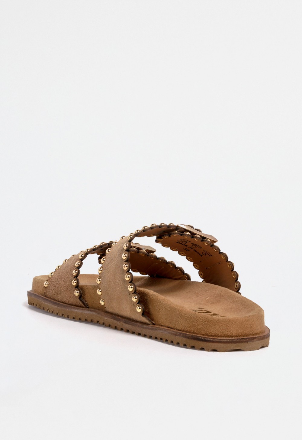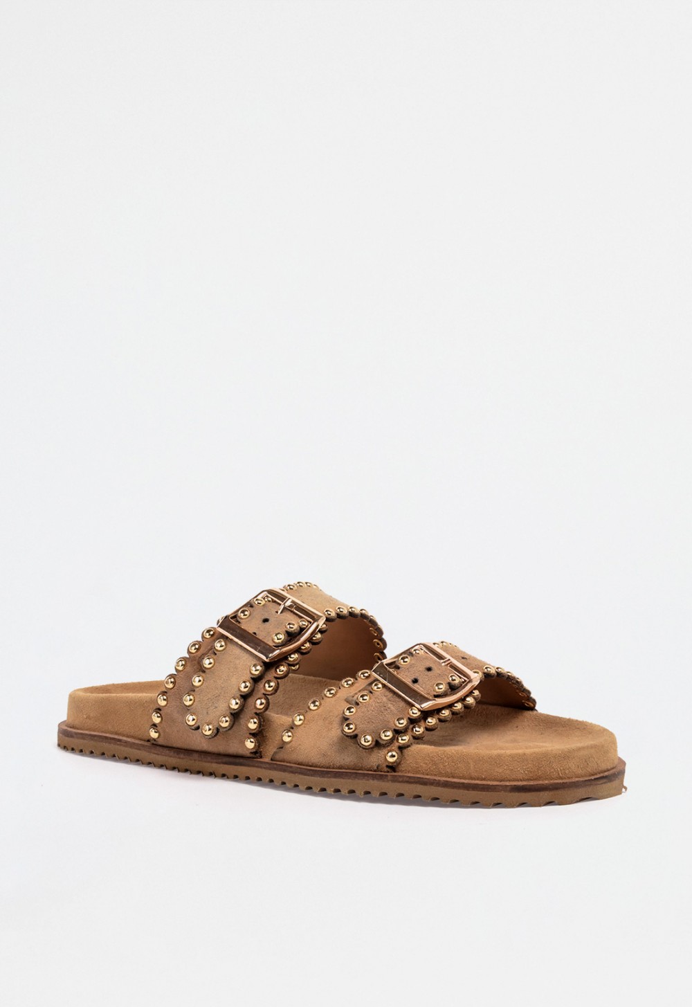 Esta sandalia plana de mujer en piel color tostado reinterpreta el clásico diseño de doble correa con un toque atrevido: pequeñas tachas doradas que aportan carácter sin perder elegancia. Confeccionada en piel de calidad, ofrece confort y estilo para el día a día o planes informales con un punto sofisticado.
