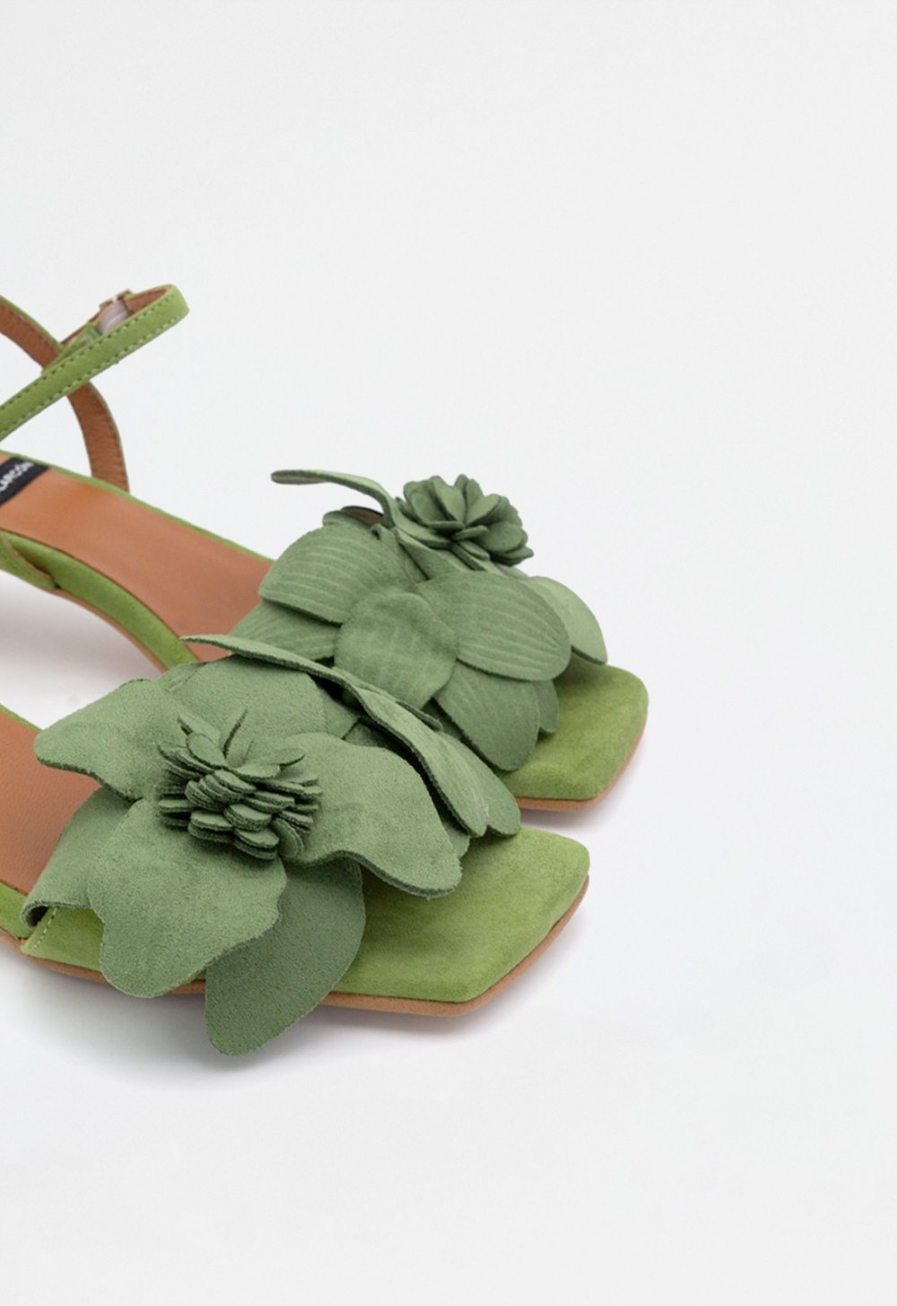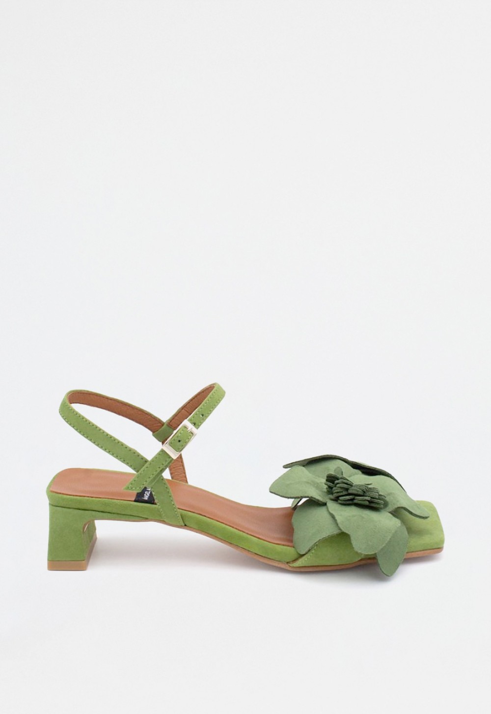 La sandalia Eugenie de Ángel Alarcón combina el confort y la elegancia en un diseño veraniego ideal para múltiples ocasiones. Fabricada en ante verde, presenta un distintivo adorno floral artesanal en la parte delantera, que realza su estilo delicado y femenino.