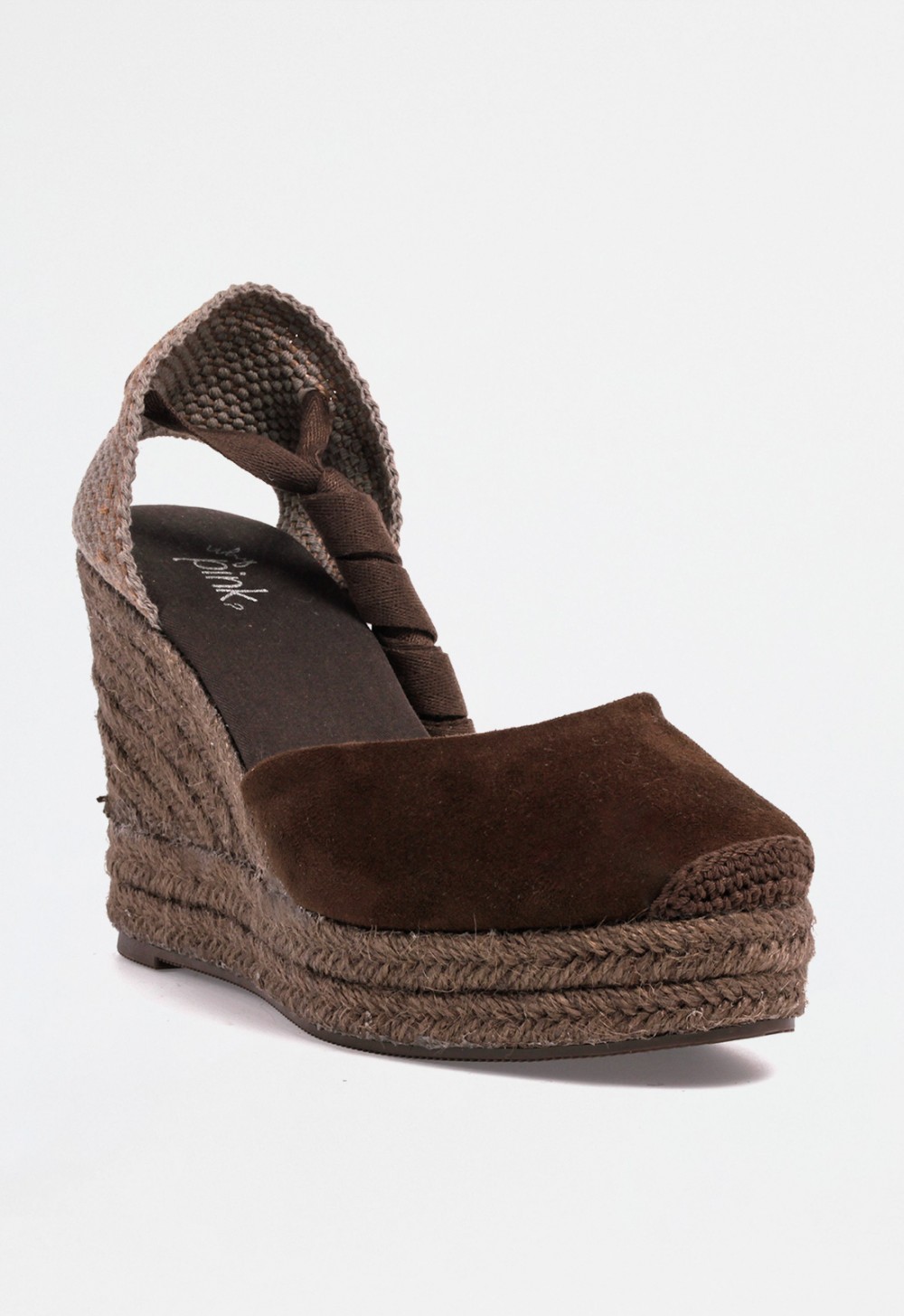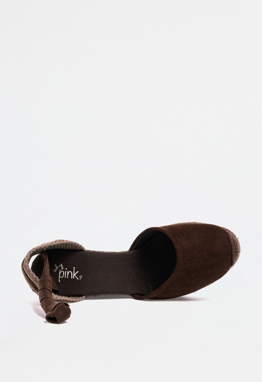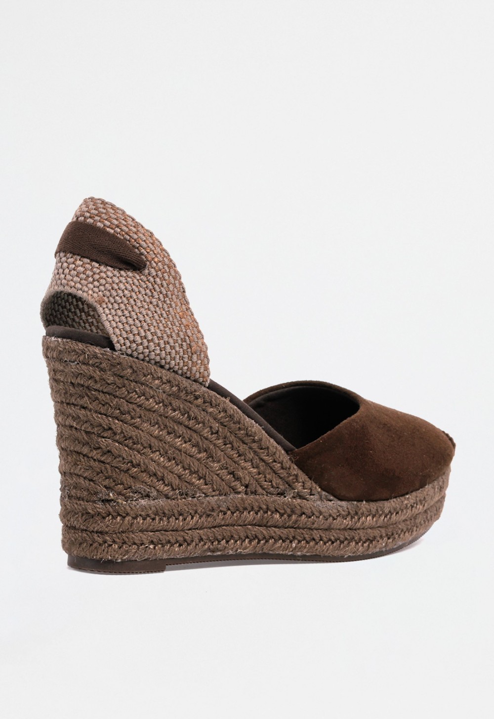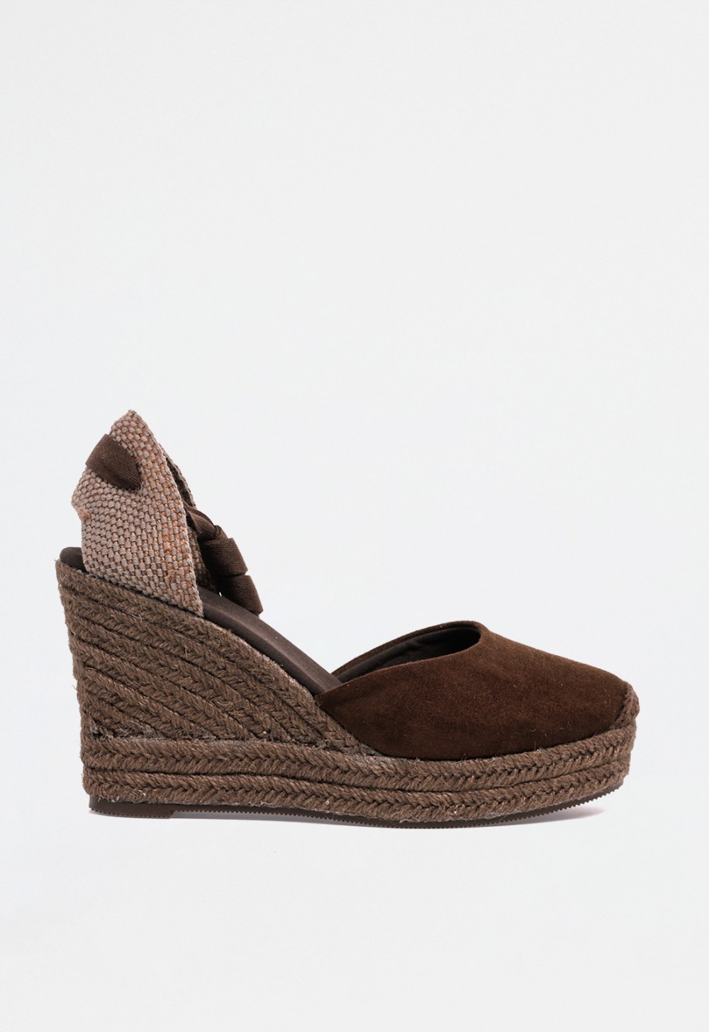 Alpargata de mujer en color marrón chocolate, con cuña alta de aproximadamente 10 cm y suela de esparto natural. Su diseño con cintas para atar al tobillo aporta un aire femenino y favorecedor, ideal para llevar tanto de día como de noche.