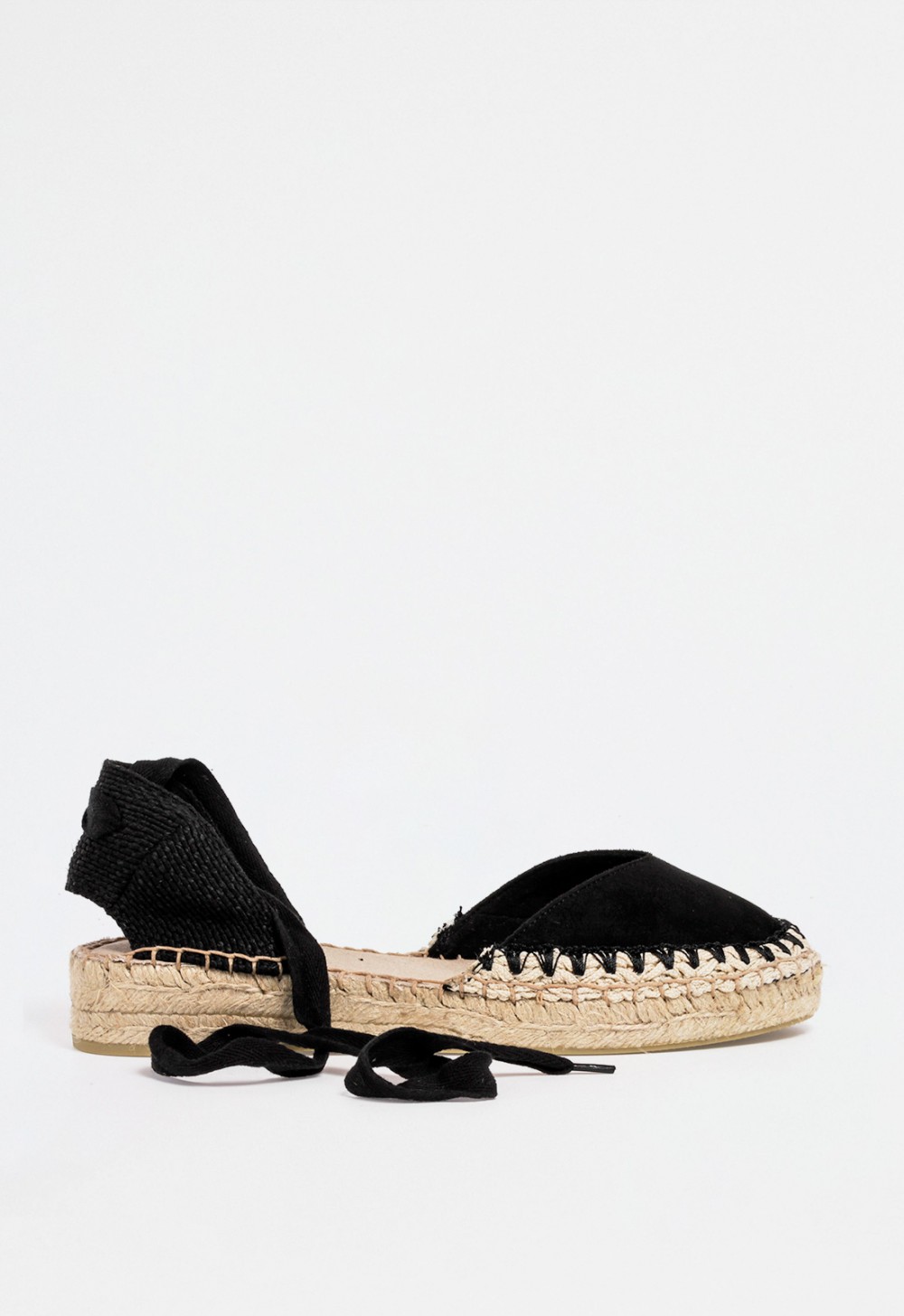 Alpargata de mujer en color negro con suela plana de esparto natural. El diseño incorpora cordones para atar a la pierna, ofreciendo sujeción y un toque romántico que estiliza. Su construcción ligera y flexible la convierte en una opción ideal para los días cálidos, tanto en la ciudad como en la costa.