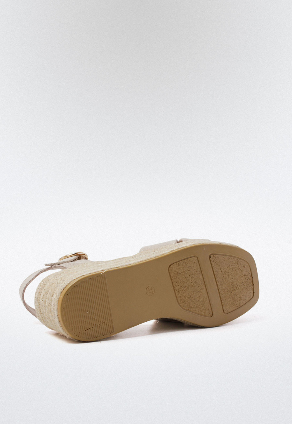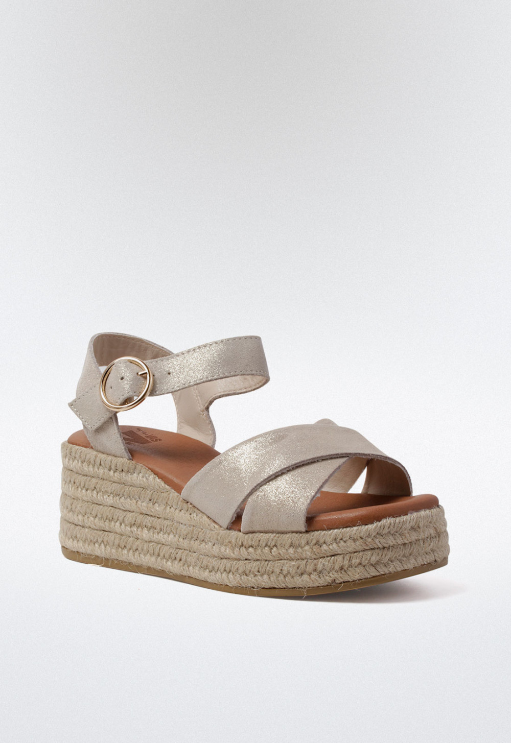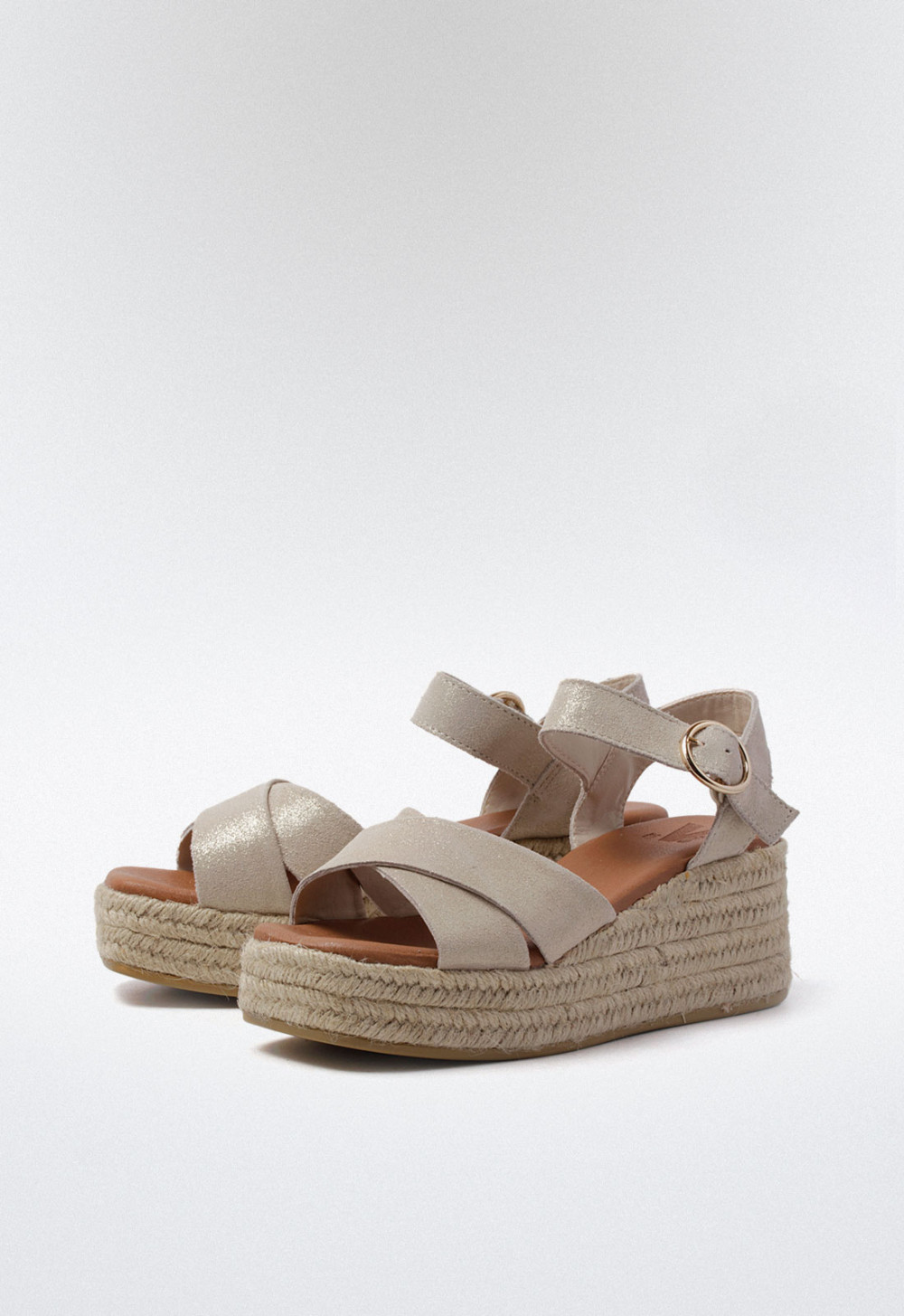 Esta sandalia de mujer con cuña de esparto combina la comodidad del tacón estable con un diseño luminoso y sofisticado. Sus tiras cruzadas en color oro aportan un toque chic, perfecto para elevar cualquier outfit sin perder frescura.