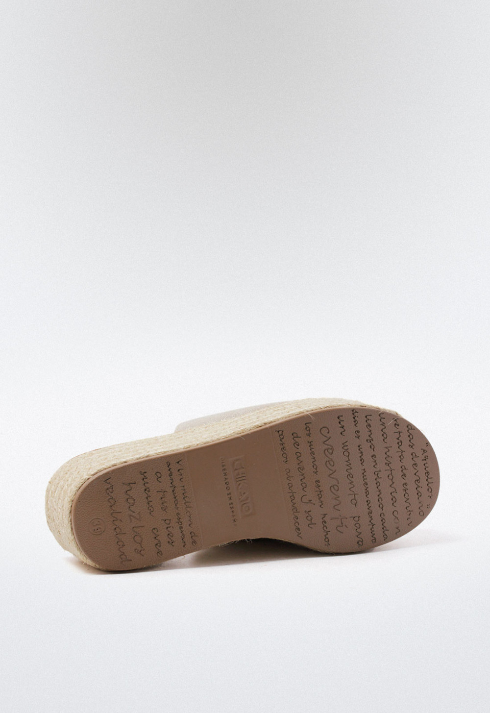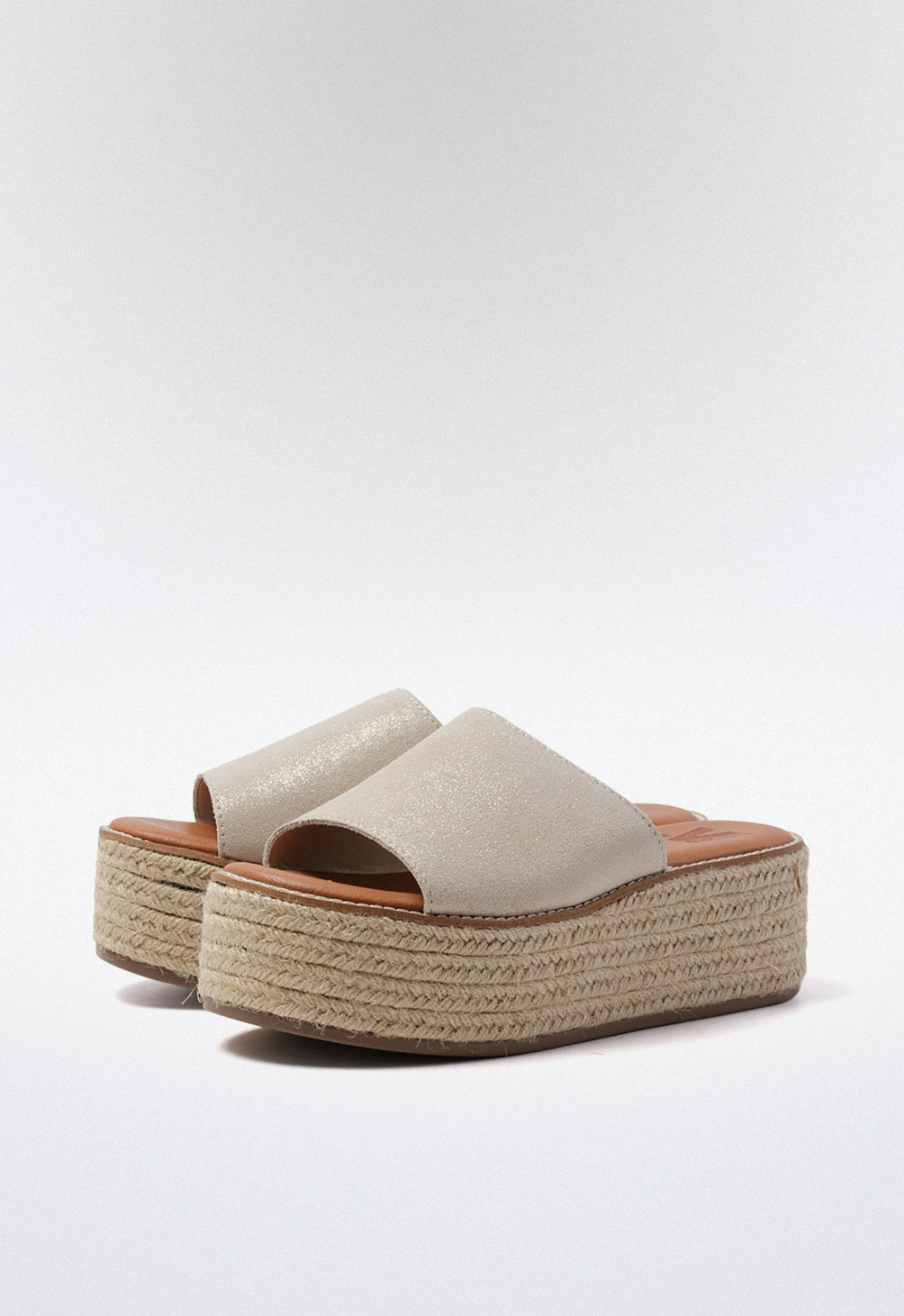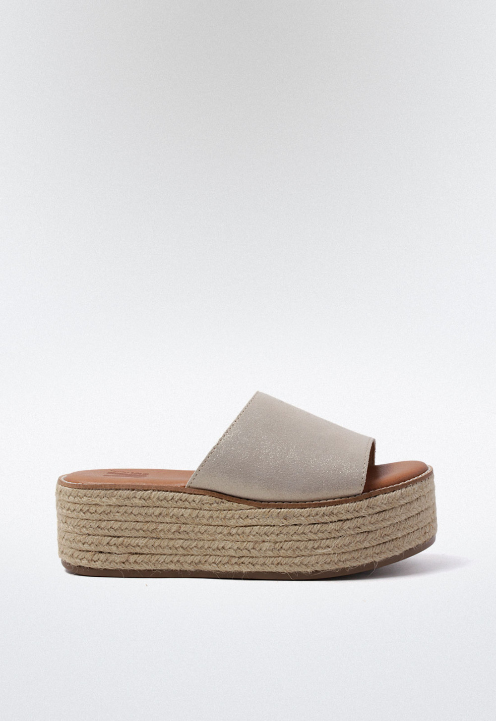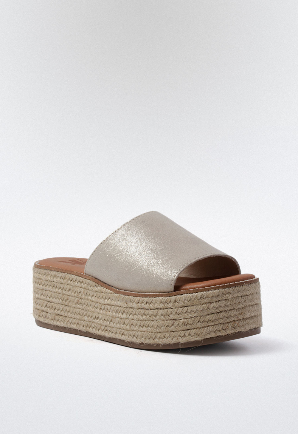 Esta sandalia de plataforma plana con doble suela en esparto está diseñada para sumar altura sin renunciar a la comodidad ni al estilo. Su tira ancha en el empeine, en un elegante color platino con brillo, convierte este modelo en una opción ideal tanto para looks casuales como para outfits más sofisticados.