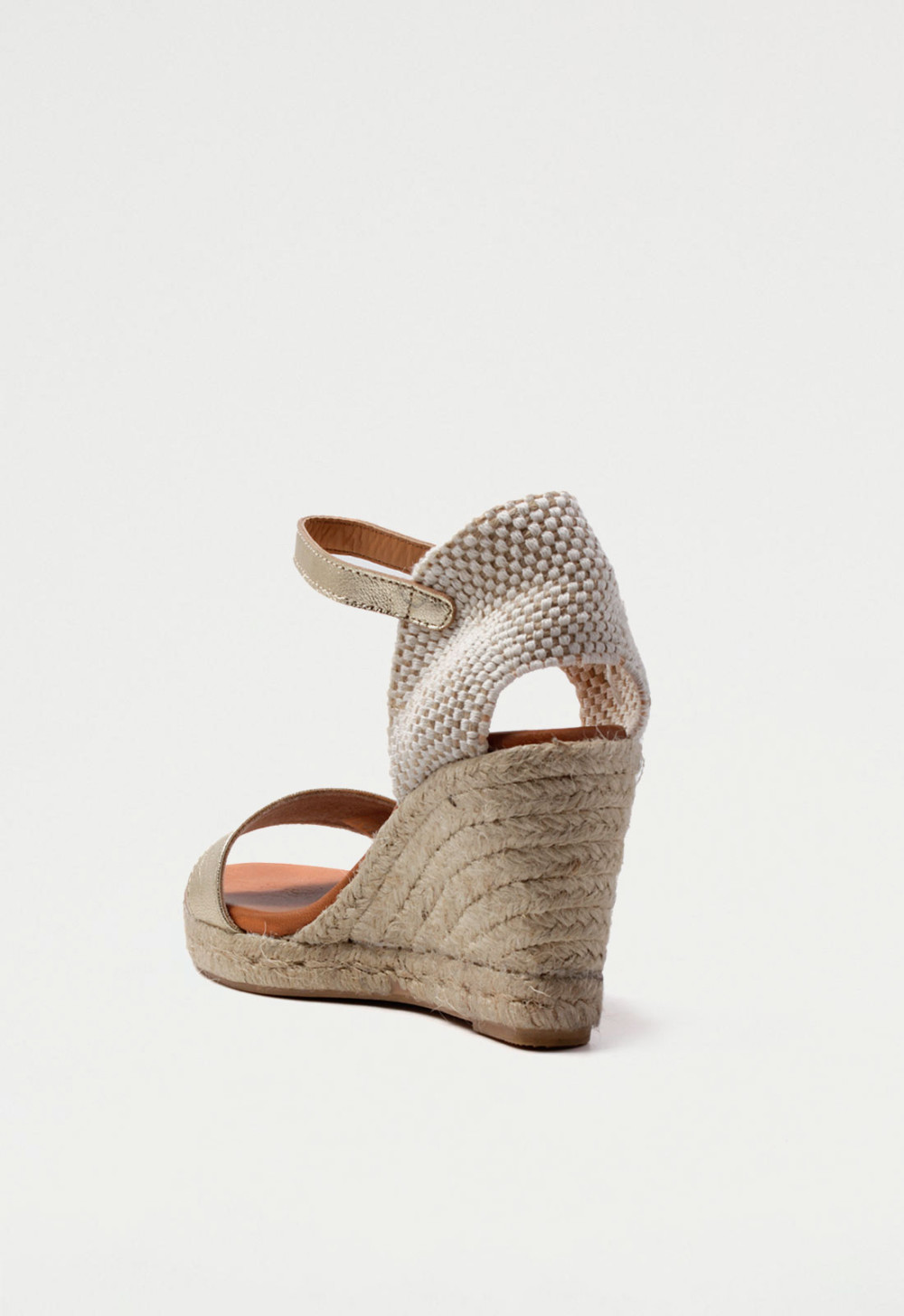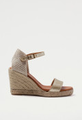 Brillo sutil y altura con estilo: la sandalia de cuña platino ideal para tus looks de verano.