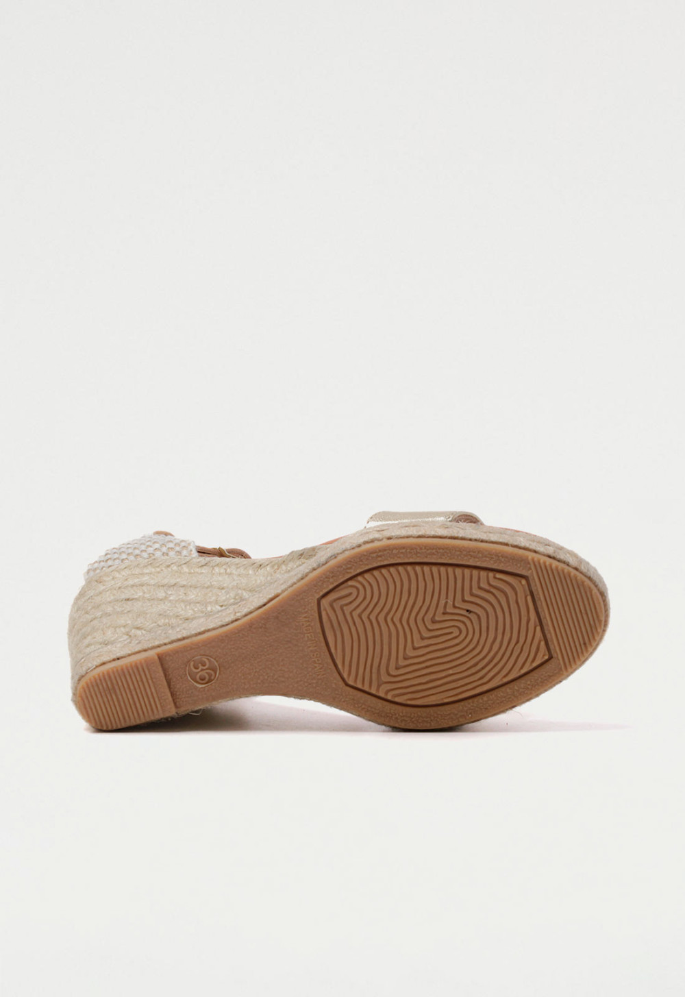Esta sandalia de mujer con cuña alta destaca por su diseño femenino y moderno. Fabricada con tiras en acabado platino con brillo, aporta un toque luminoso y elegante sin perder naturalidad, gracias a su suela forrada en esparto de estilo mediterráneo.
