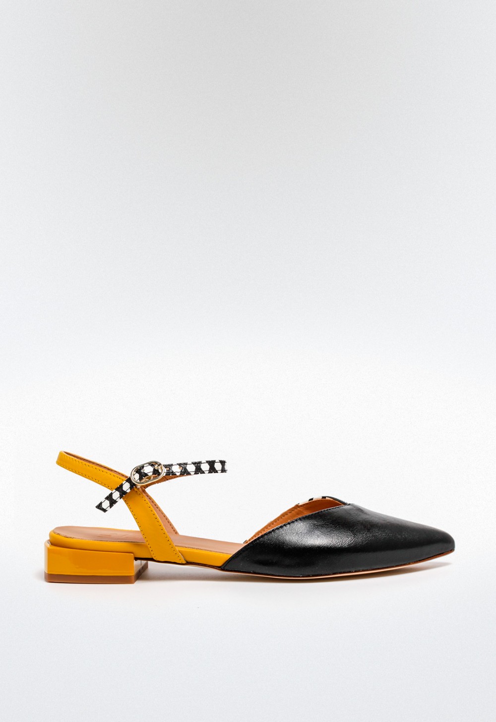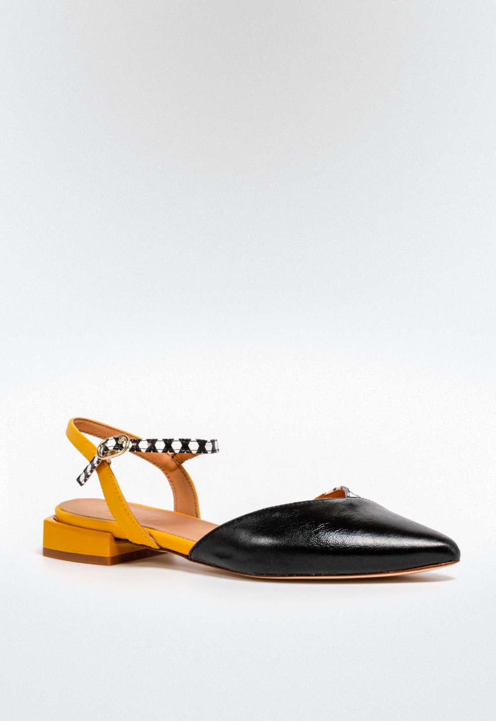 Fabricado en España en piel de alta calidad, este zapato plano de diseño exclusivo combina comodidad y estilo con un acabado vibrante en color amarillo. Su silueta destalonada y el cierre mediante hebilla lateral aportan frescura y un ajuste perfecto, ideal para los meses de primavera y verano.