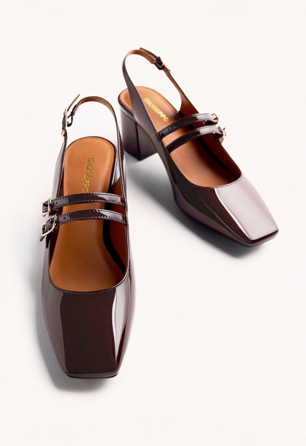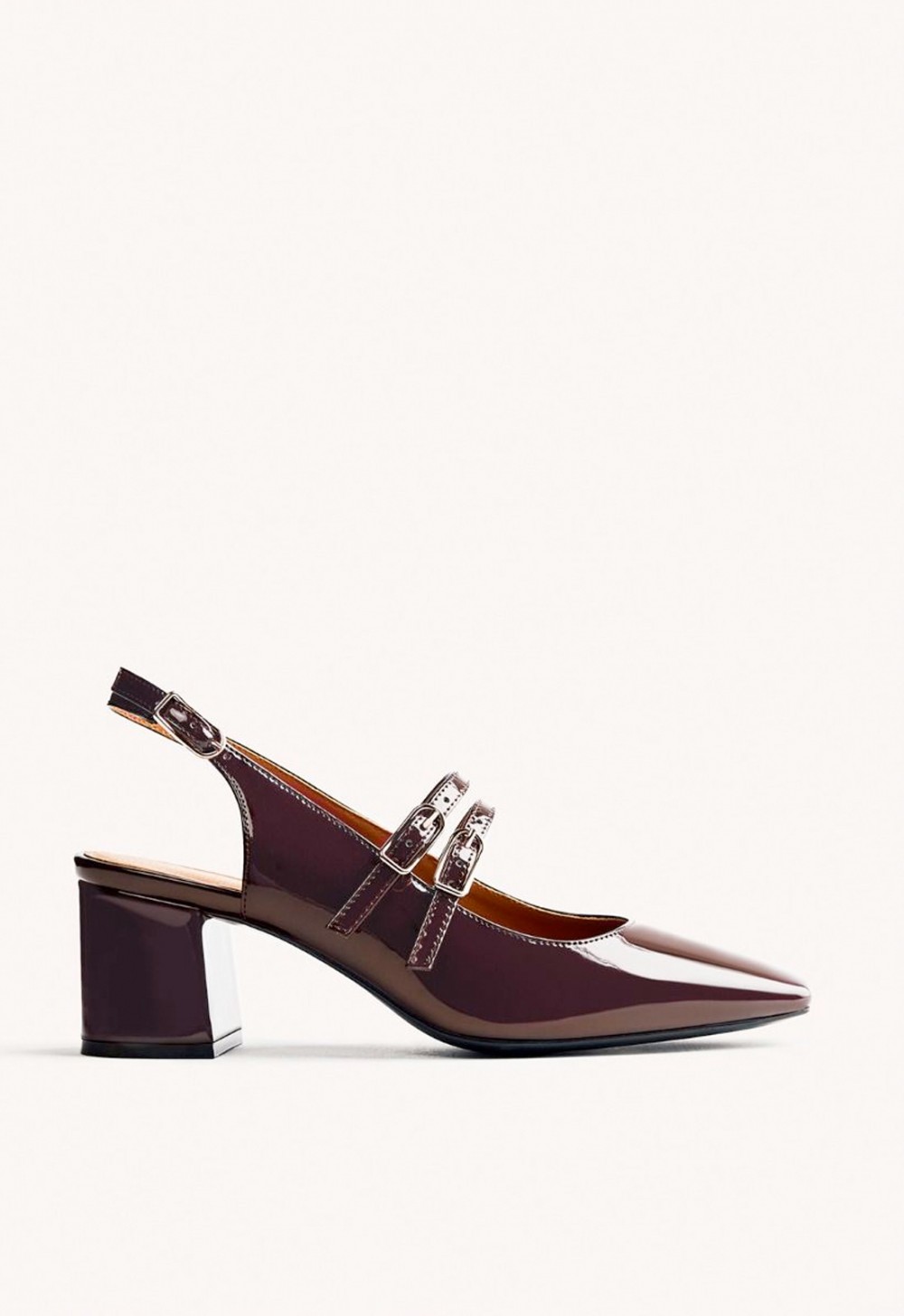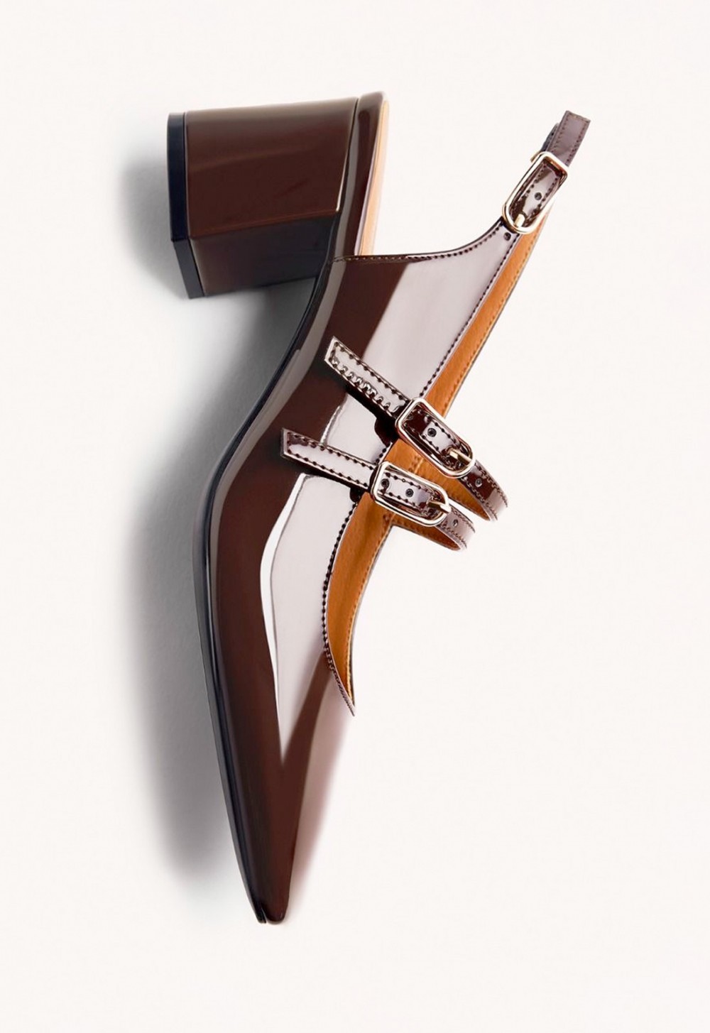 Diseño Mary-Jane destalonado en charol marrón de inspiración retro-chic