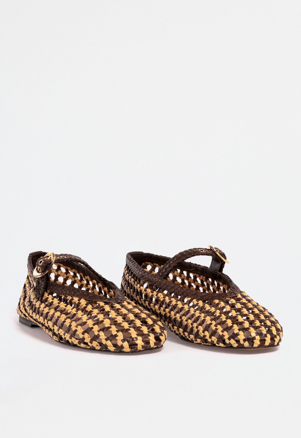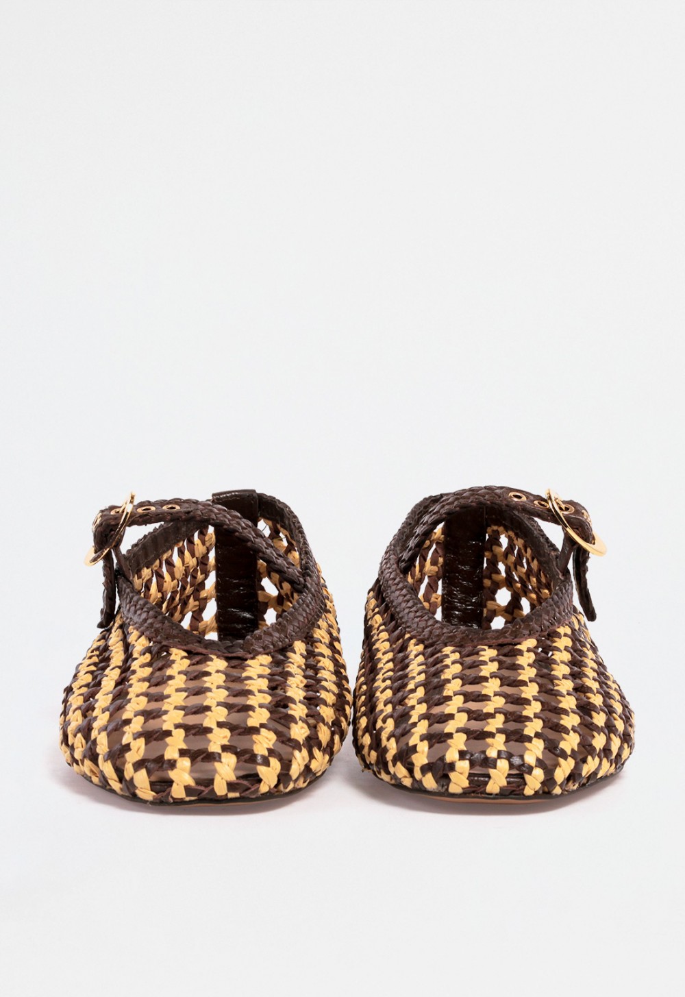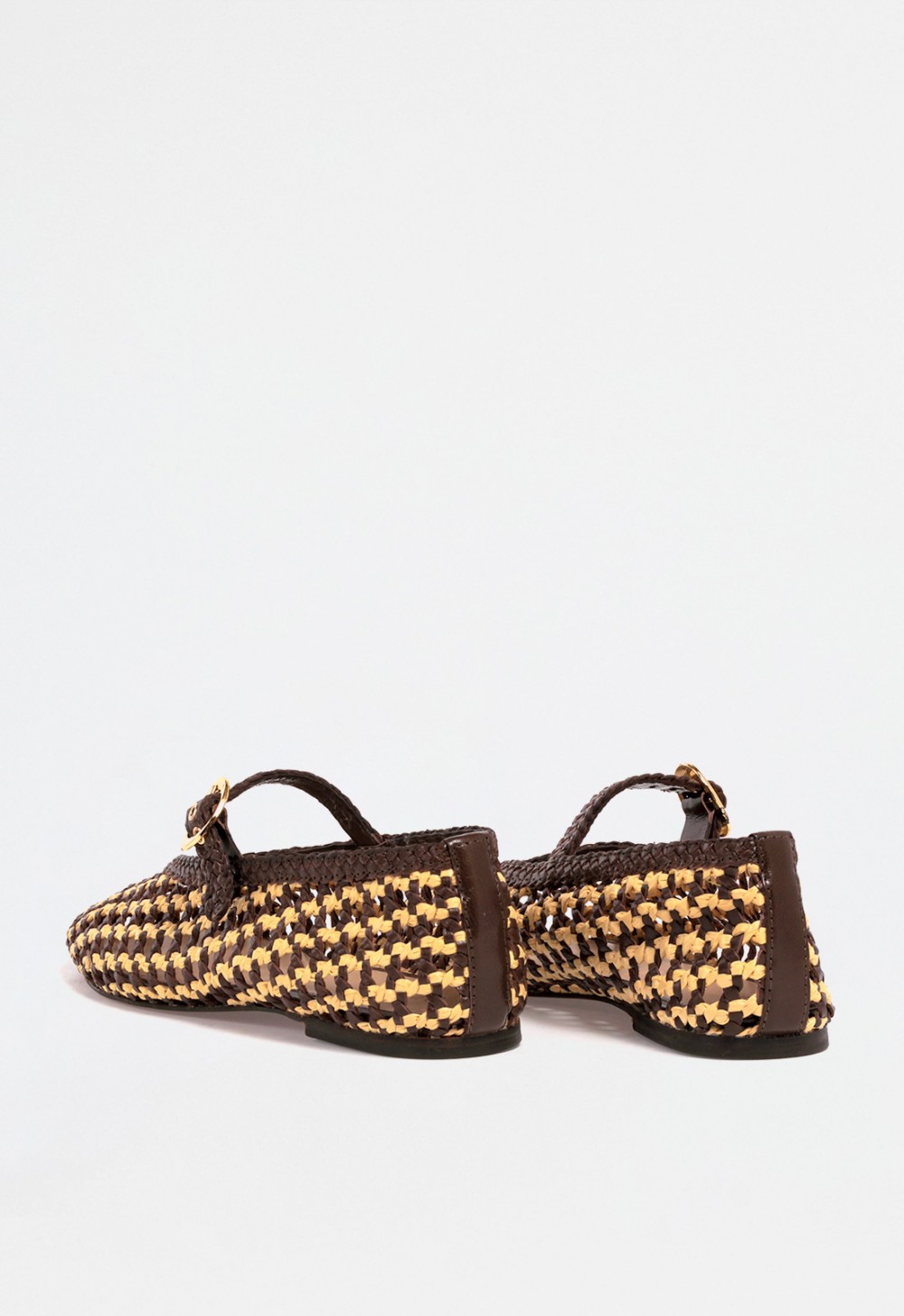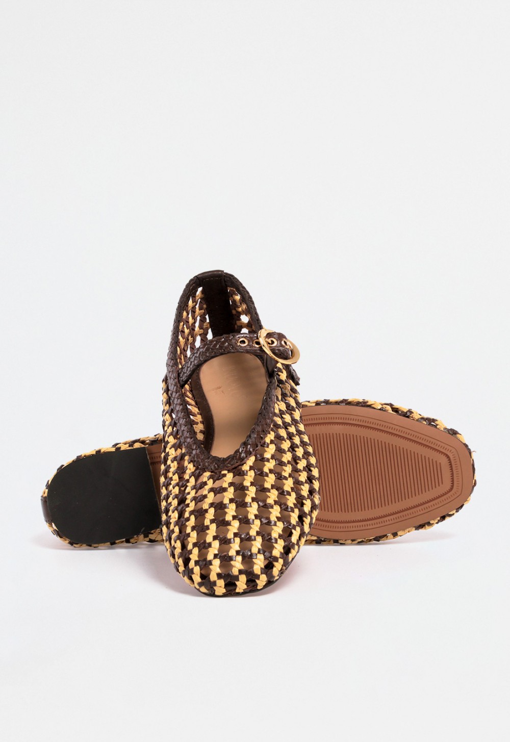 Zapato estilo bailarina de mujer, trenzado en tonos marrón y beige, con diseño bicolor que combina elegancia natural y tendencia. La tira frontal con hebilla dorada aporta un toque decorativo y funcional, que realza el empeine con sutileza.