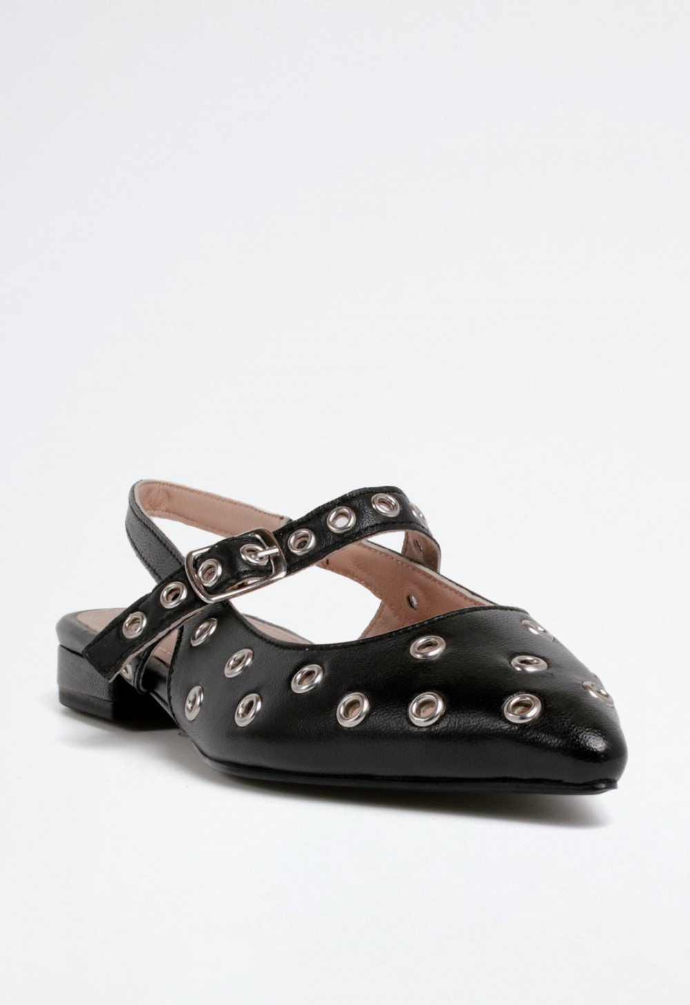 Este modelo combina comodidad y actitud gracias a su acabado en piel de alta calidad, su diseño destalonado y el toque urbano que le aportan las tachas metálicas. El cierre con hebilla pequeña ofrece ajuste y estilo, convirtiéndolo en un zapato perfecto para acompañar outfits casuales con un punto diferenciador.